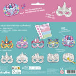 5 masques à décorer ou à colorier, une superbe planche de strass pour les personnaliser et une jolie pochette pour ranger tes créations.