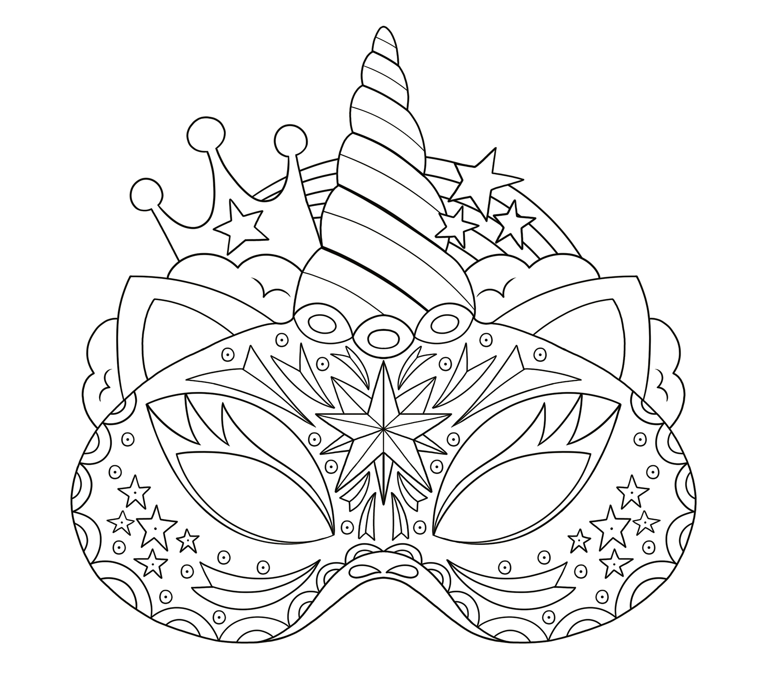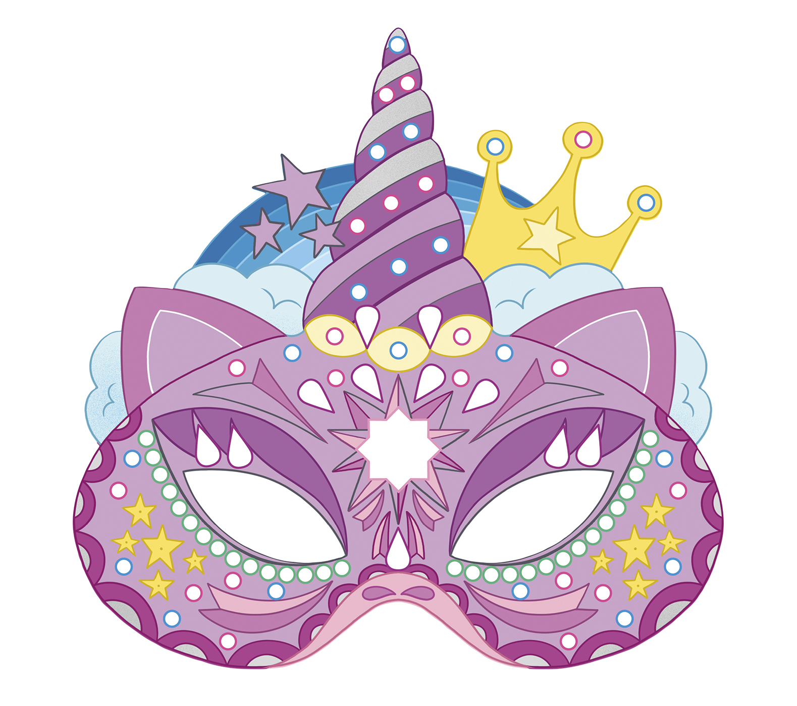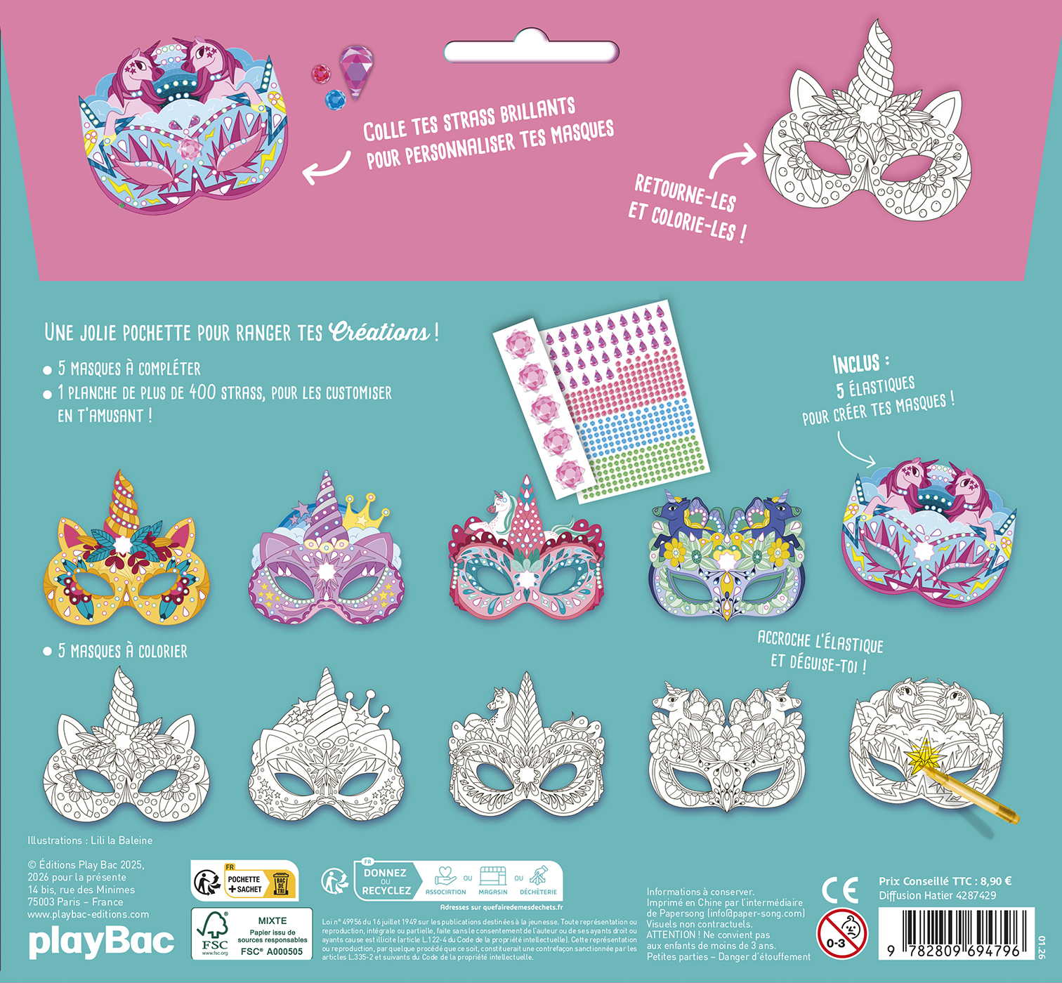 5 masques à décorer ou à colorier, une superbe planche de strass pour les personnaliser et une jolie pochette pour ranger tes créations.