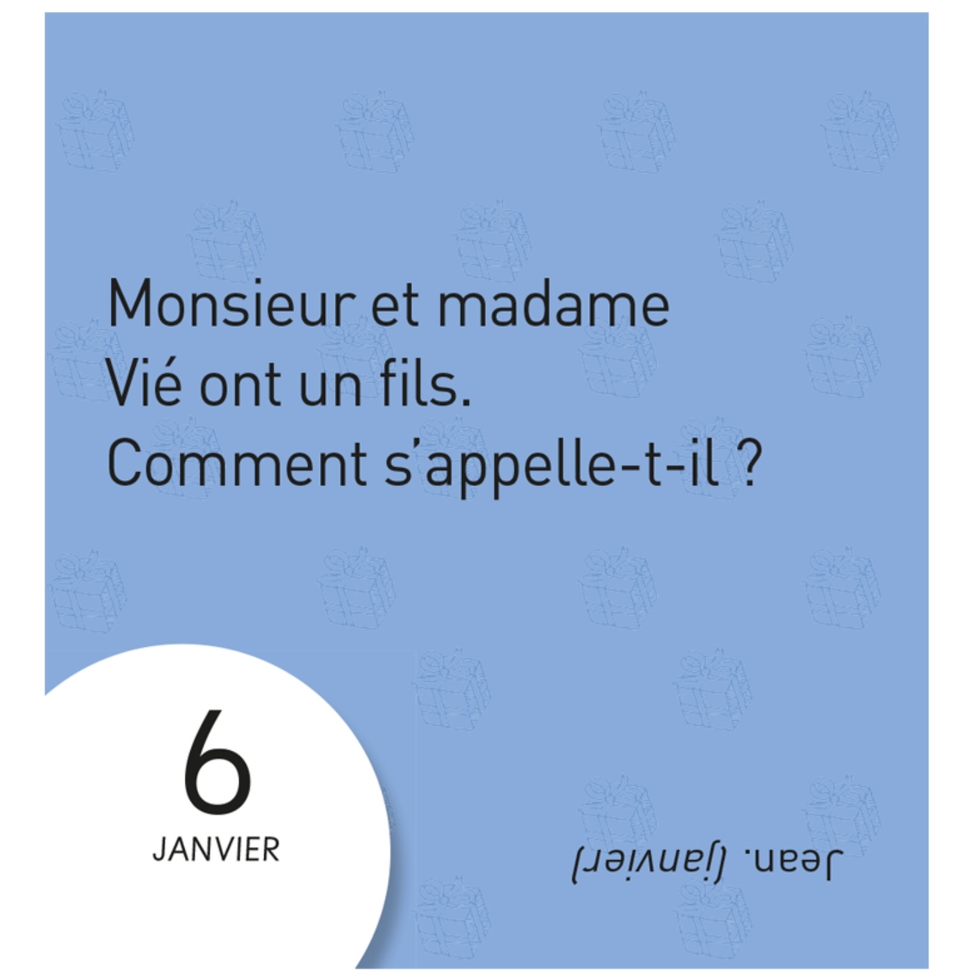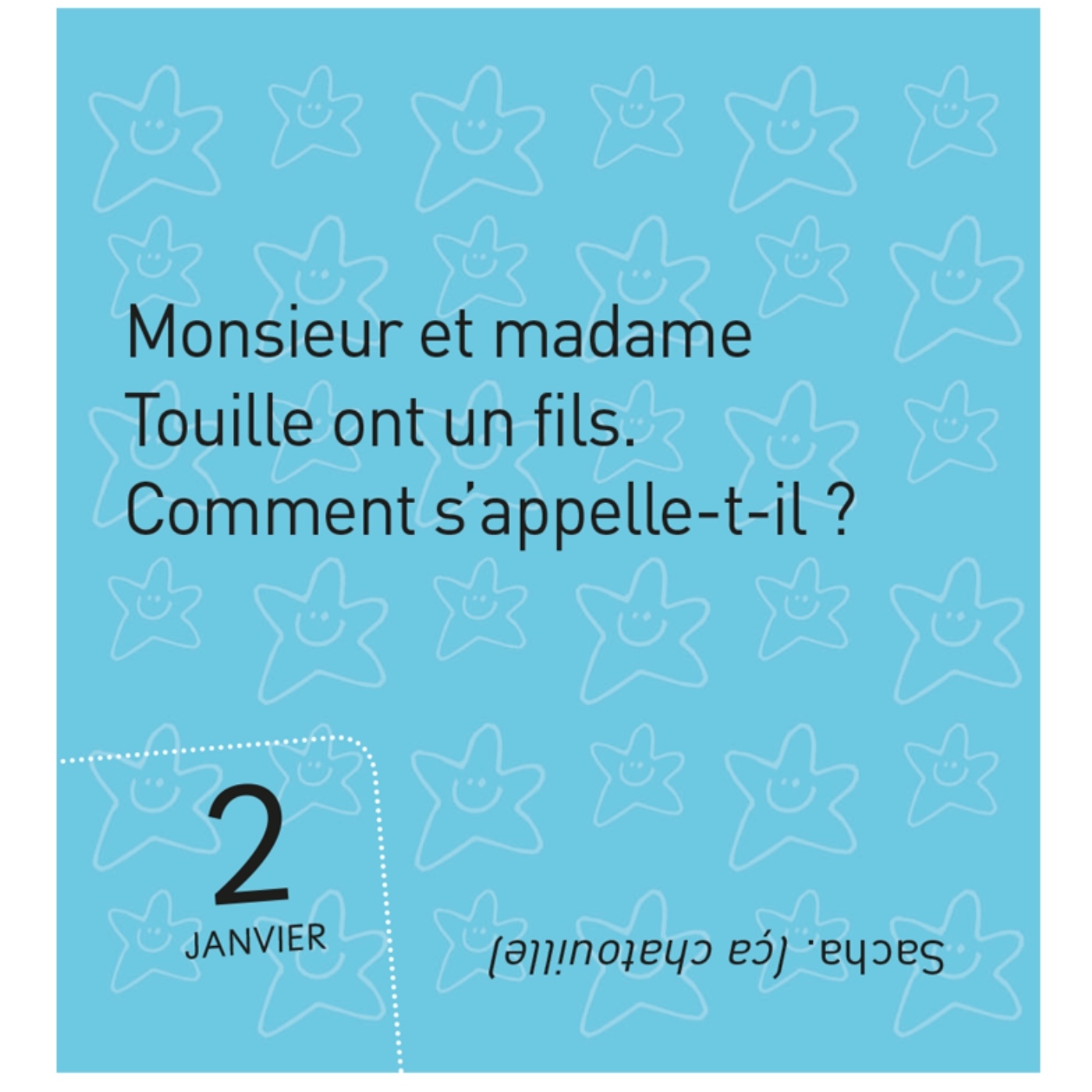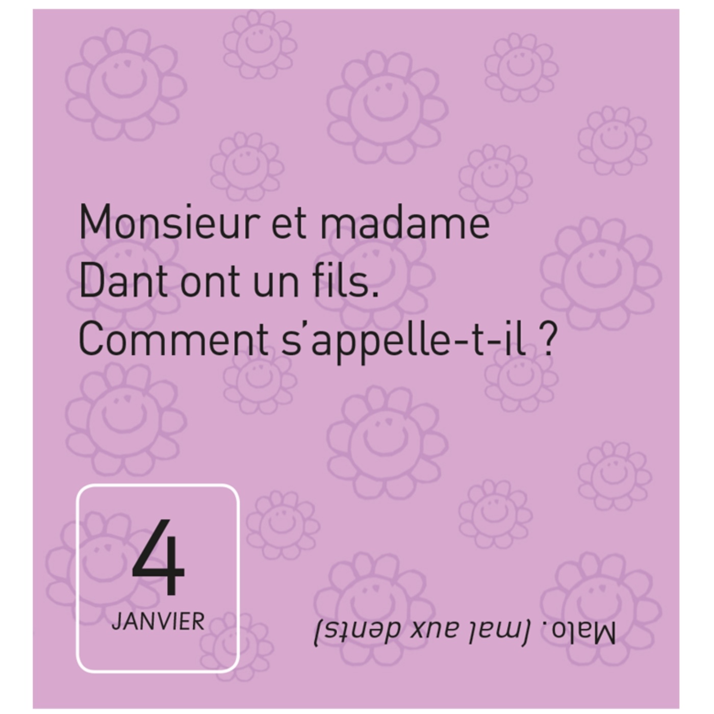 Découvrez, dans ce mini calendrier, 365 blagues de « Monsieur et Madame… ont un fils/une fille » pour tous les enfants et pour s’amuser, chaque jour de l’année, à deviner les prénoms des enfants de Monsieur et Madame.