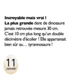 Une année complètement dino pour les fans du jurassique avec ce mini calendrier. Tu as envie de tout savoir sur le diplodocus, le tyrannosaure ou le tricératops ? C'est parti pour 365 jours de découvertes et de jeux pour découvrir le monde des dinosaures en s'amusant ! Quiz, visuels, blagues, infos étonnantes, anecdotes amusantes : tu sauras tout sur leur vie, leur apparence, leur alimentation, leur histoire (et la préhistoire)… De quoi passer une année 100 % dino !