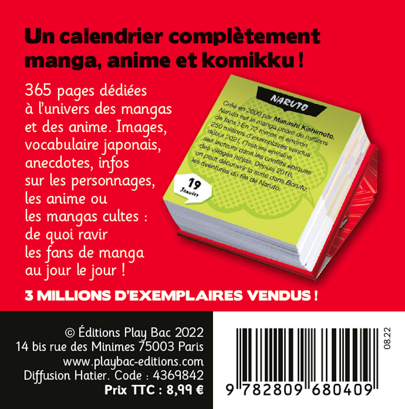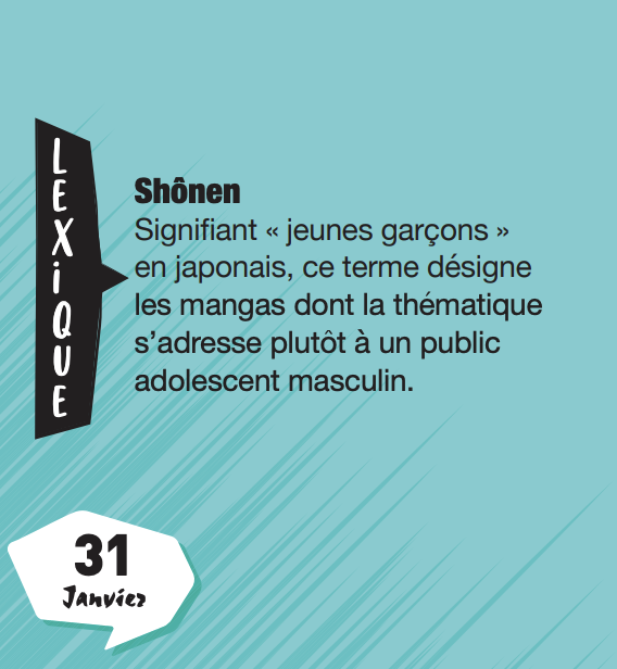 Découvrez, dans ce mini calendrier, 365 pages dédiées à l’univers des mangas et des anime. Visuels, vocabulaire japonais, anecdotes, infos sur les personnages, les animes ou les mangas cultes : de quoi ravir les fans de manga au jour le jour !