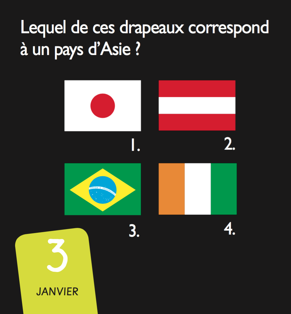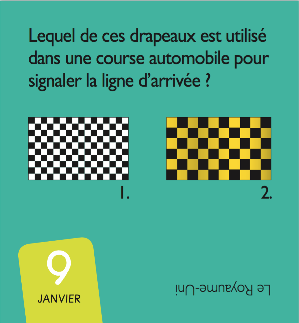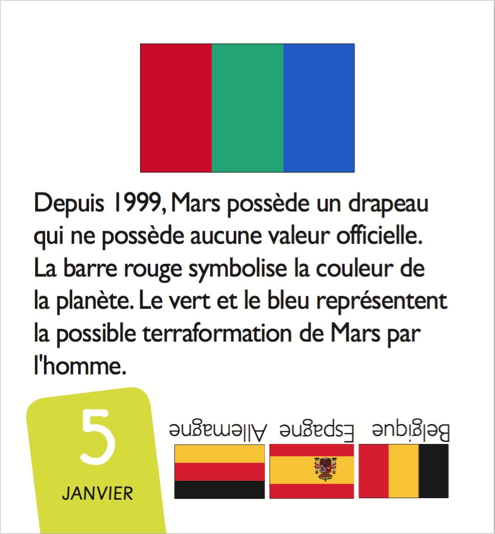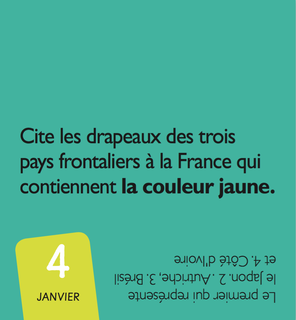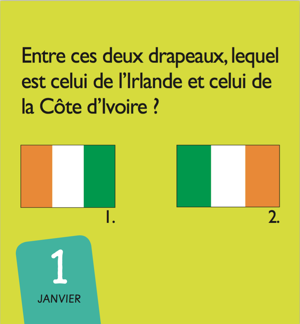 Les enfants les adorent. Tous les drapeaux des pays du monde (et quelques autres : drapeaux de pirate, drapeaux de signalisation…) en 365 jours de quiz. Le mini calendrier pour tester ses connaissances tout au long de l'année.