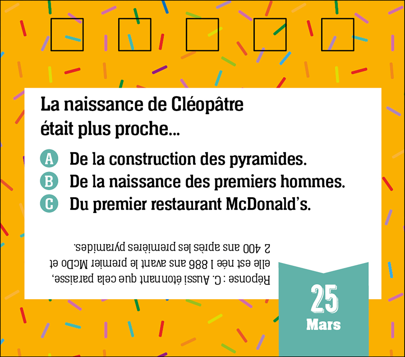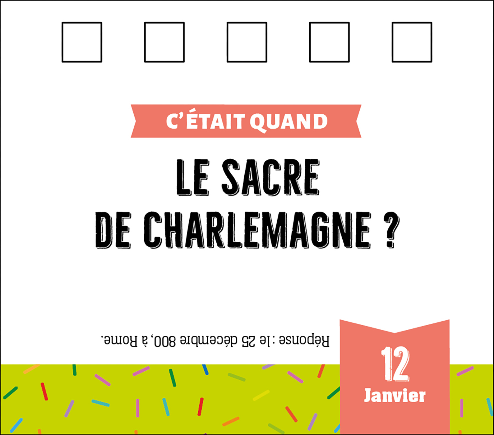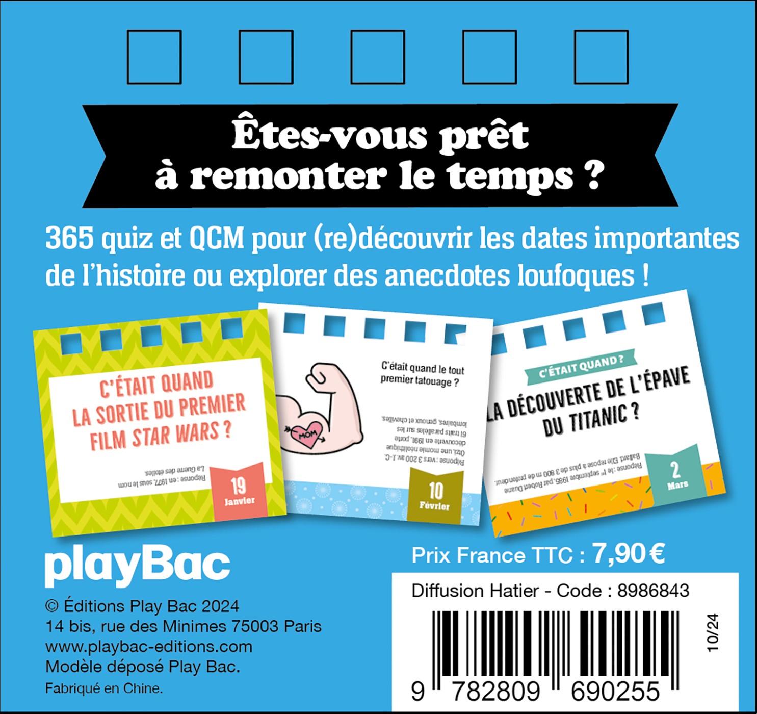 365 quiz et QCM pour réviser les dates importantes ou découvrir des anecdotes loufoques, dans un adorable petit format chevalet à poser partout.