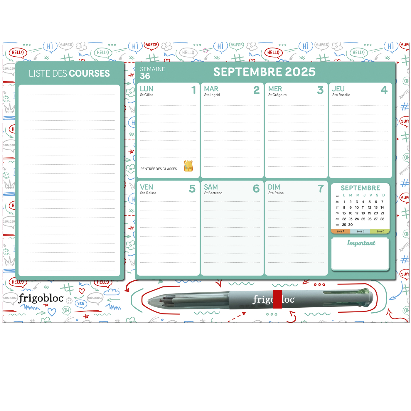 FRIGOBLOC©, LE VRAI, L'ORIGINAL ! La marque N°1 des calendriers familiaux vous présente son FrigoBloc en version mini et avec un stylo 4 couleurs : chaque membre de la famille a la sienne pour noter son programme !
