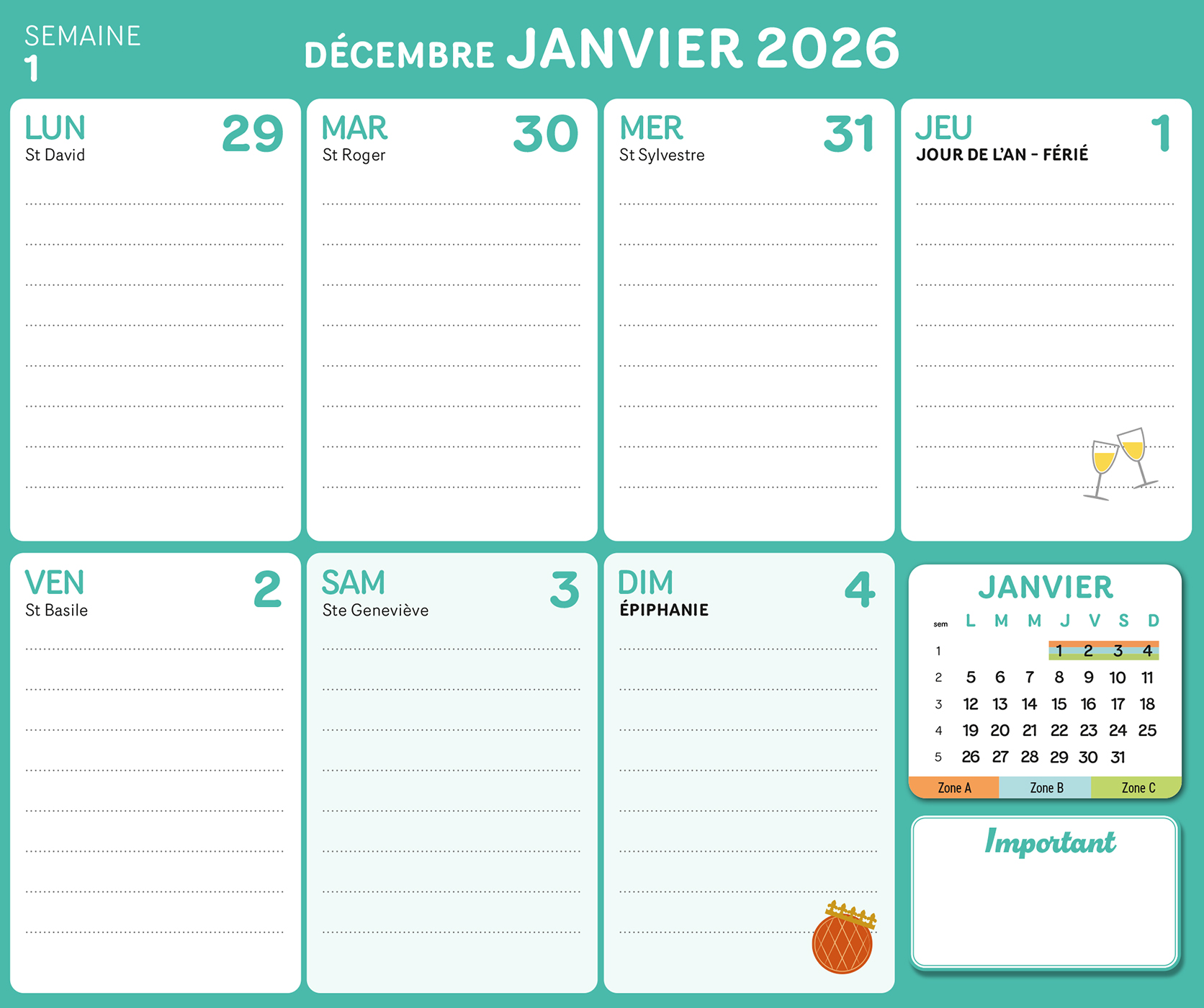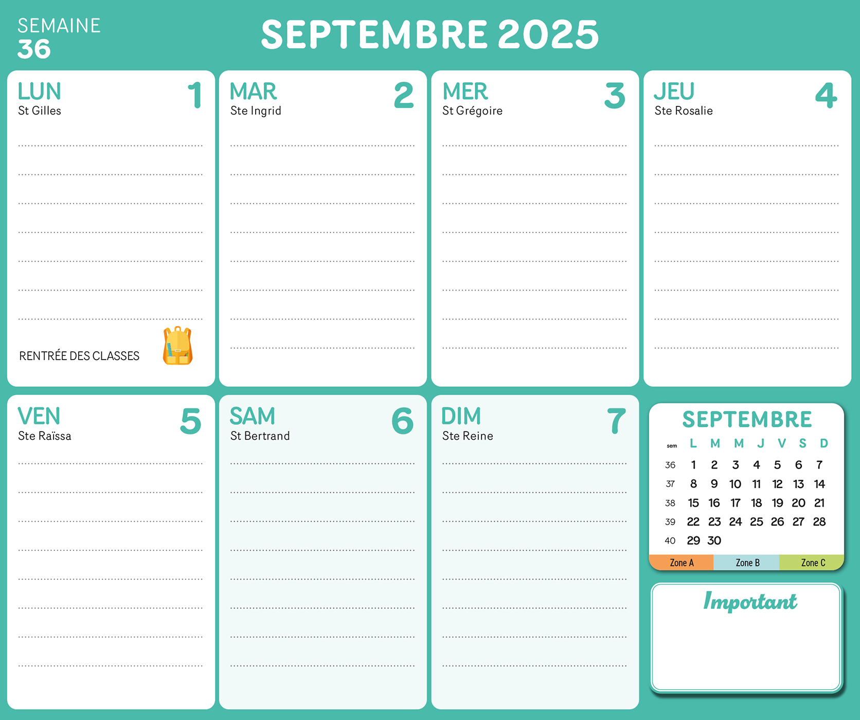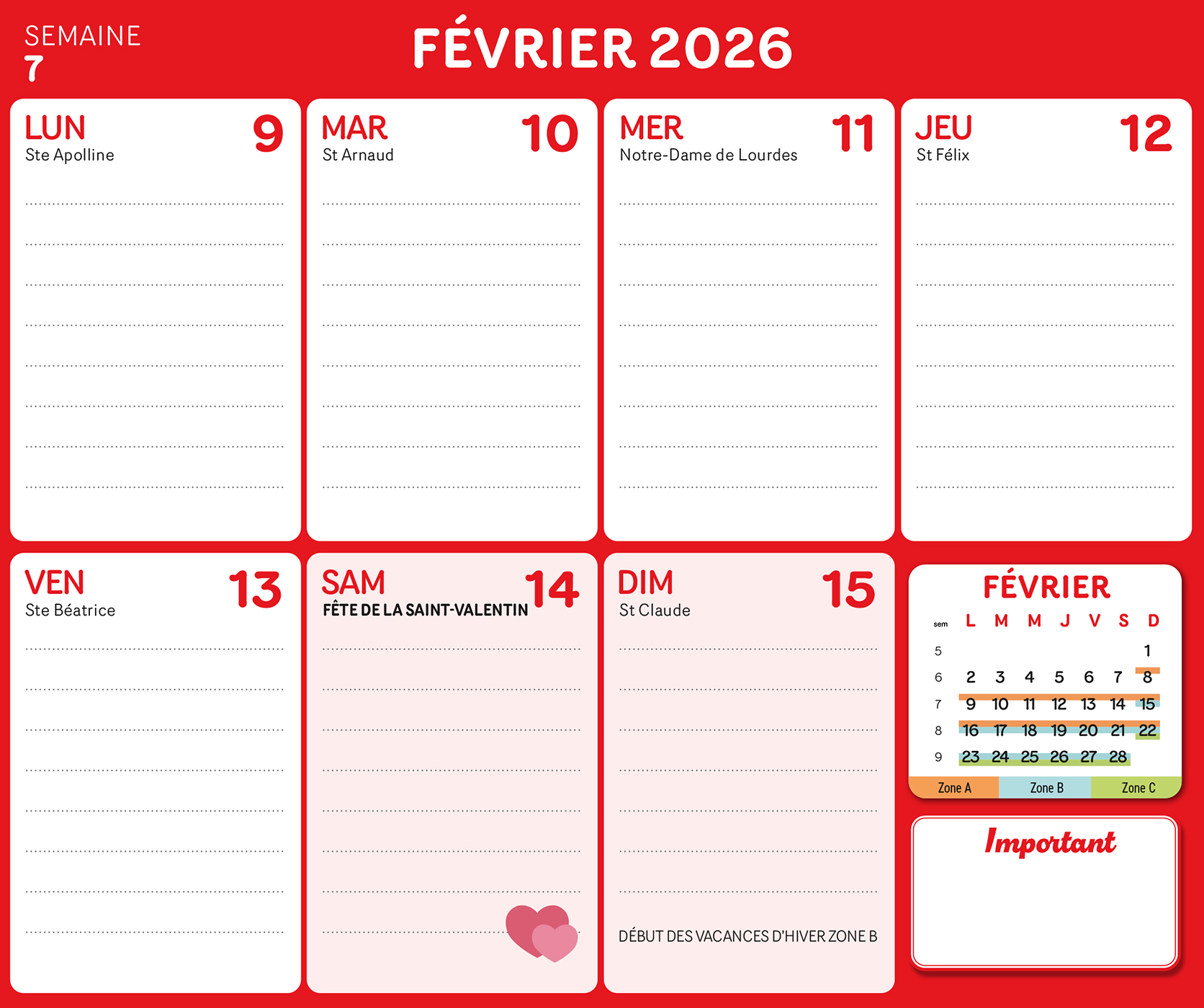 – Un planning d'organisation par semaine avec les dates officielles des vacances scolaires