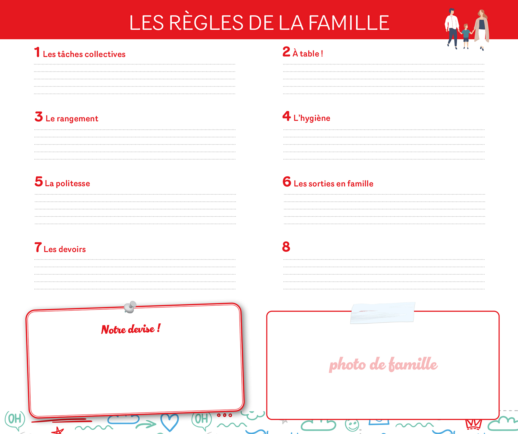 – Des fiches pratiques pour gérer le quotidien (numéros utiles, tableau de mission, to-do list des vacances, règles de la famille…)