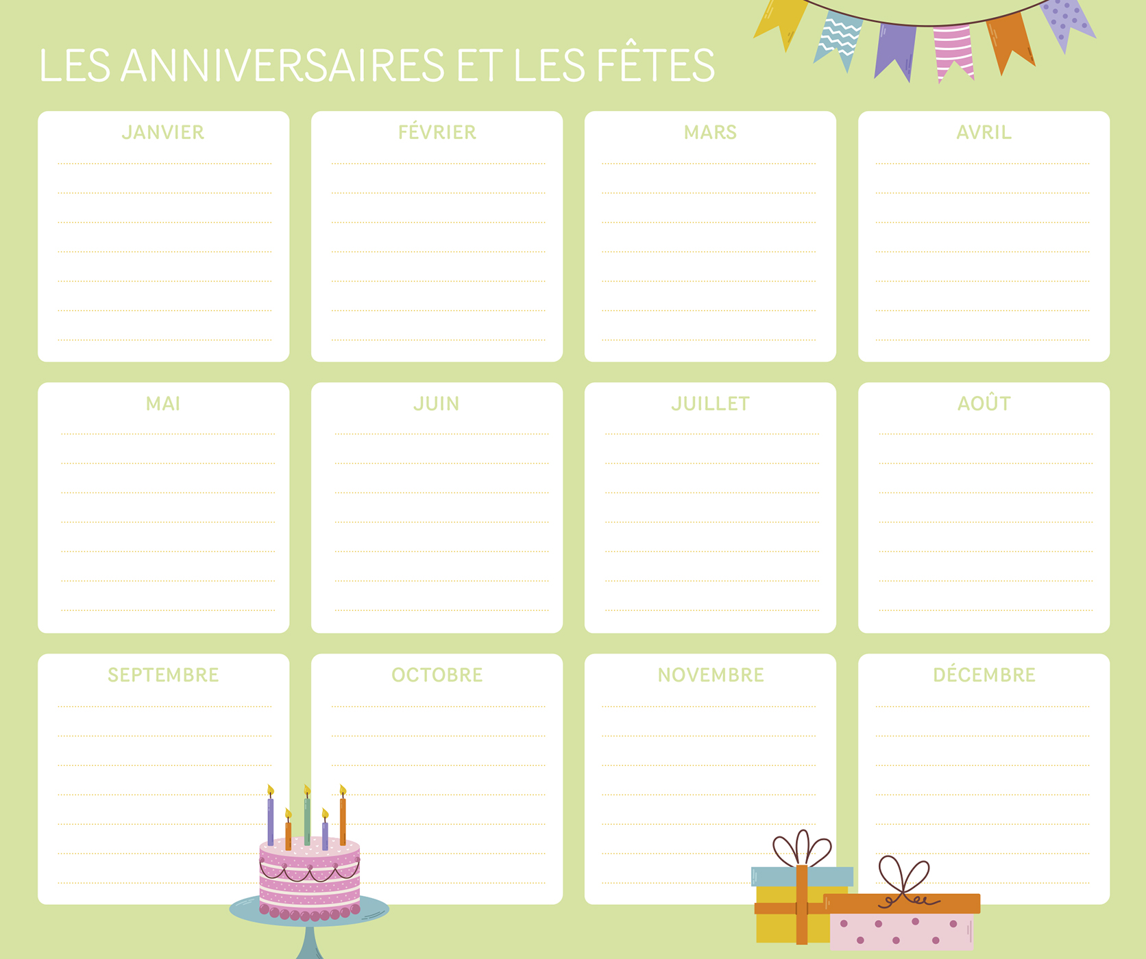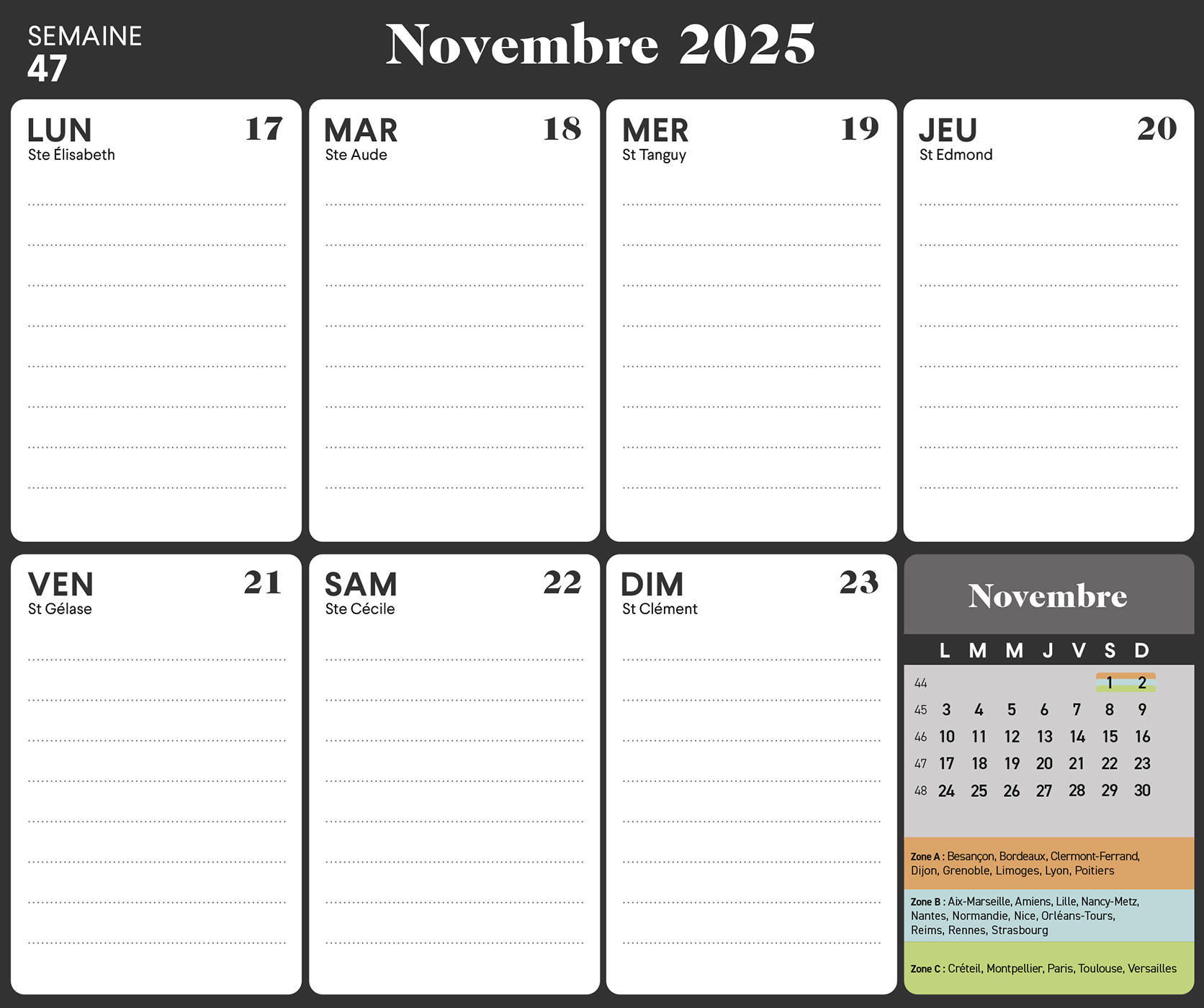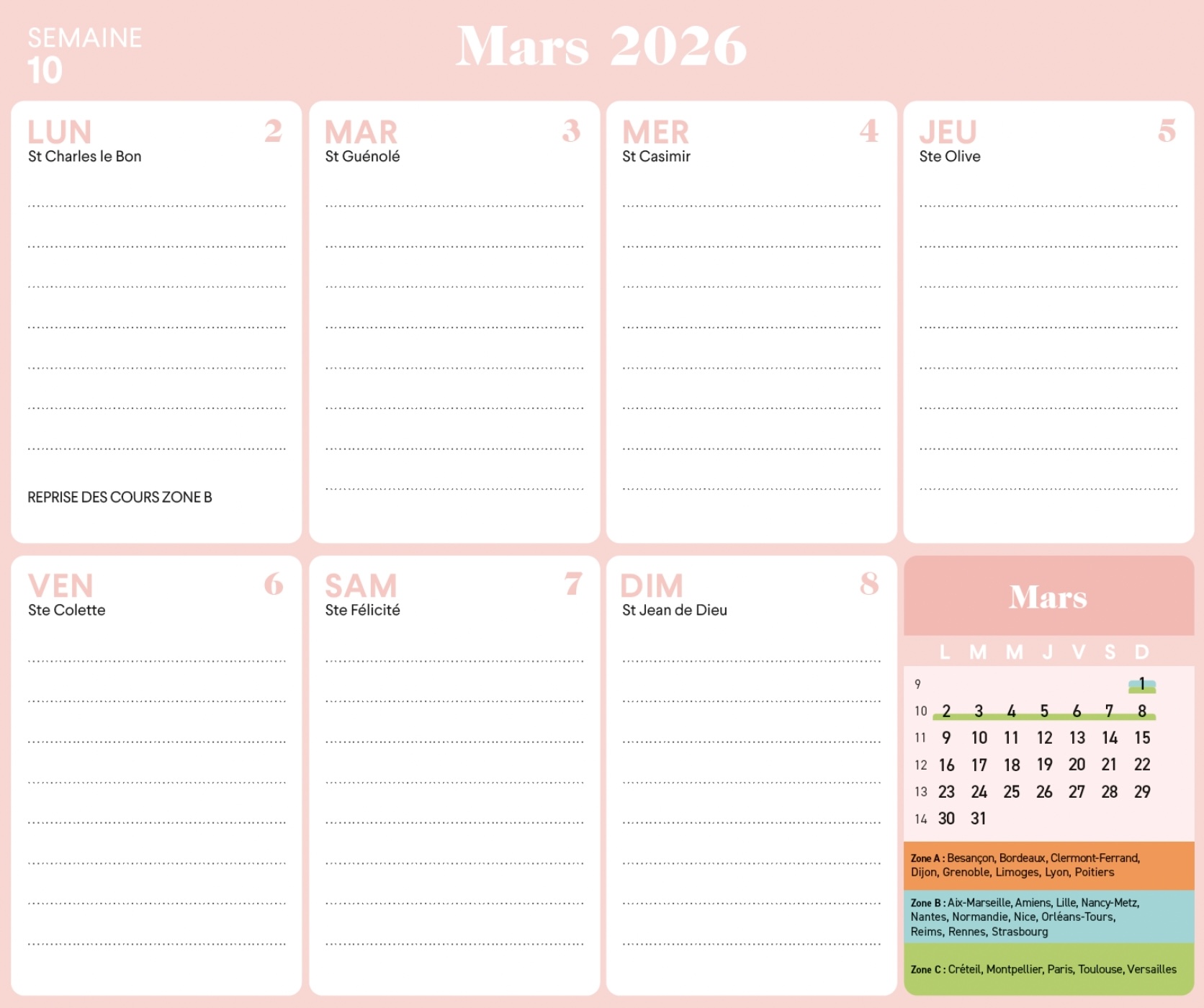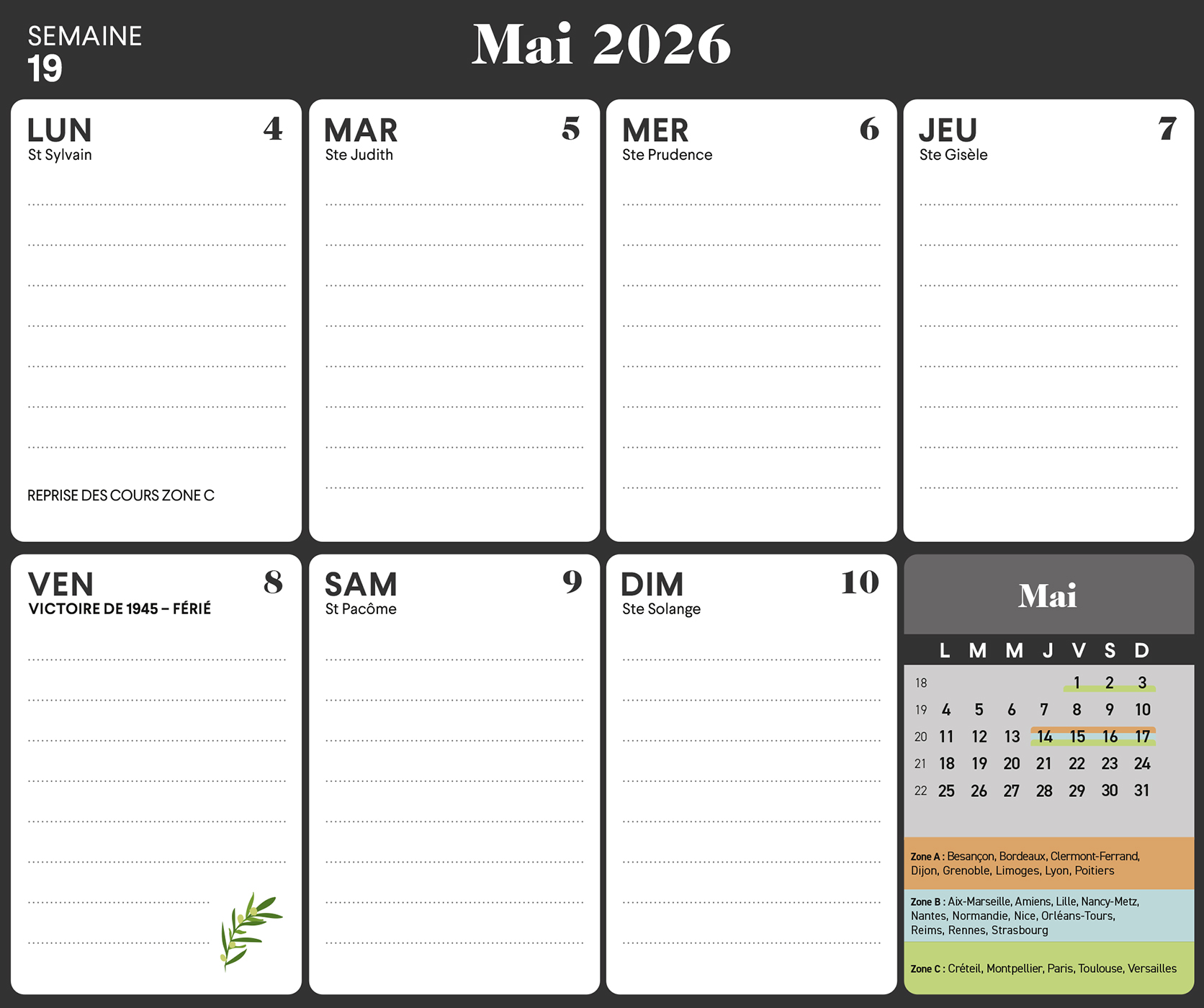 – 1 page d’organisation par semaine (grandes cases pour tout noter), avec les dates officielles des vacances scolaires,
