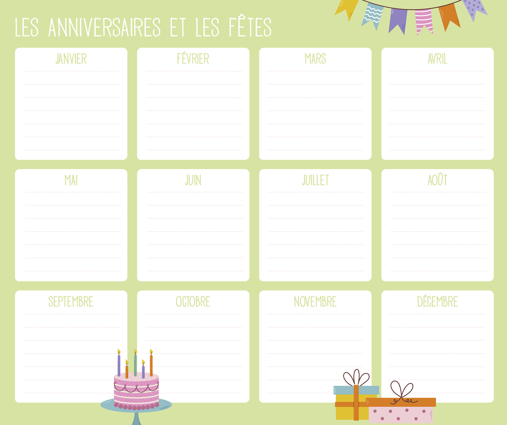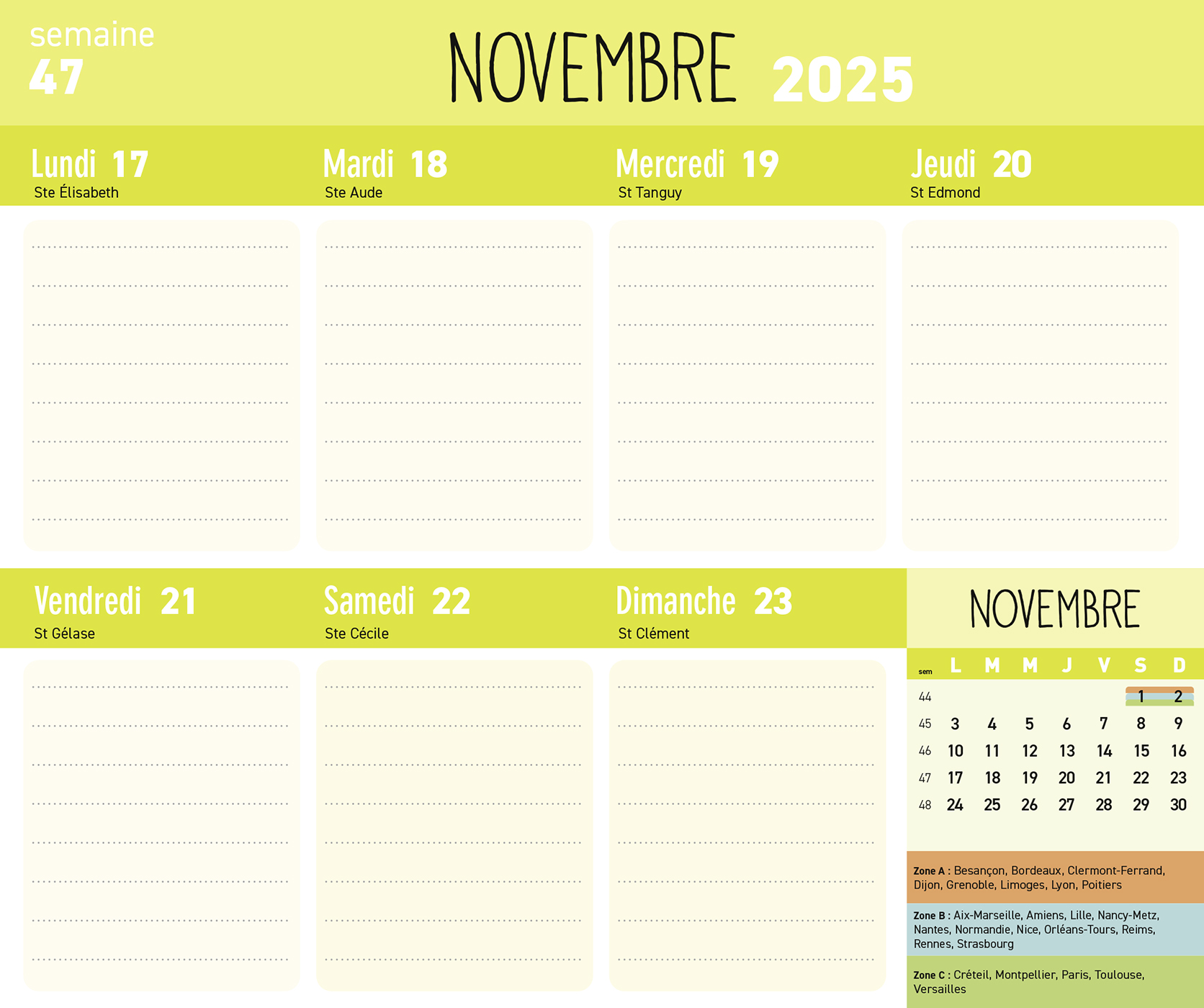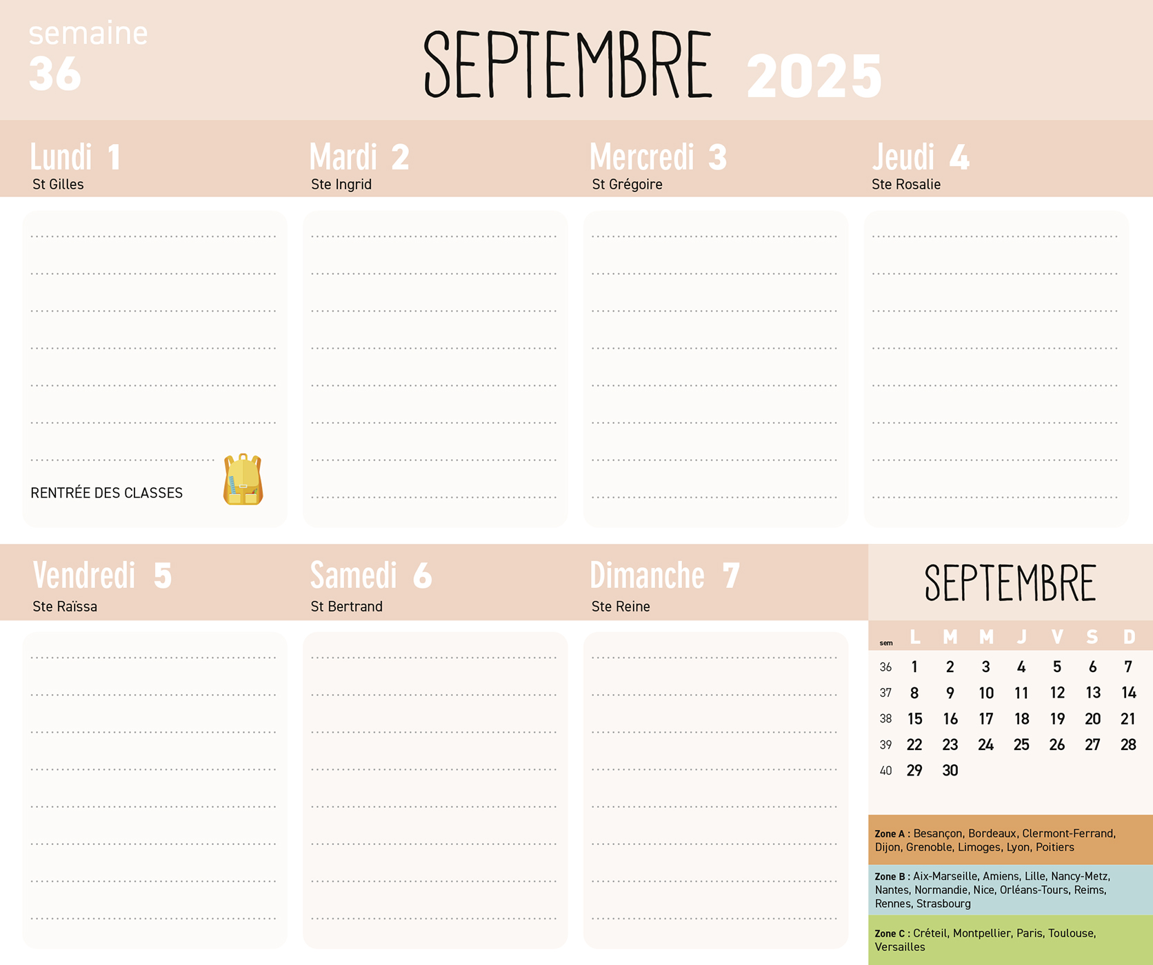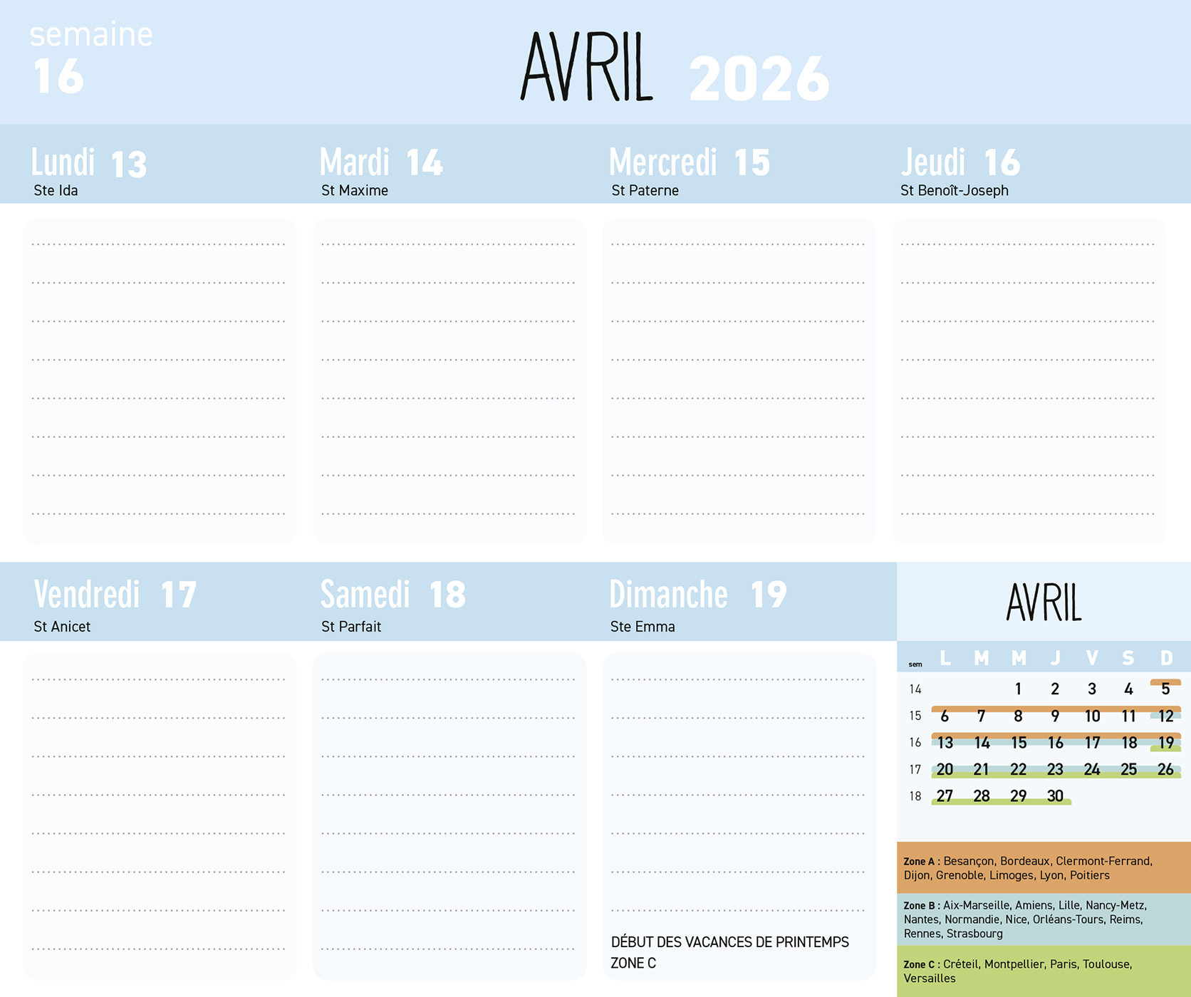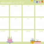 – 1 page d’organisation par semaine (grandes cases pour tout noter) avec les dates officielles des vacances scolaires,