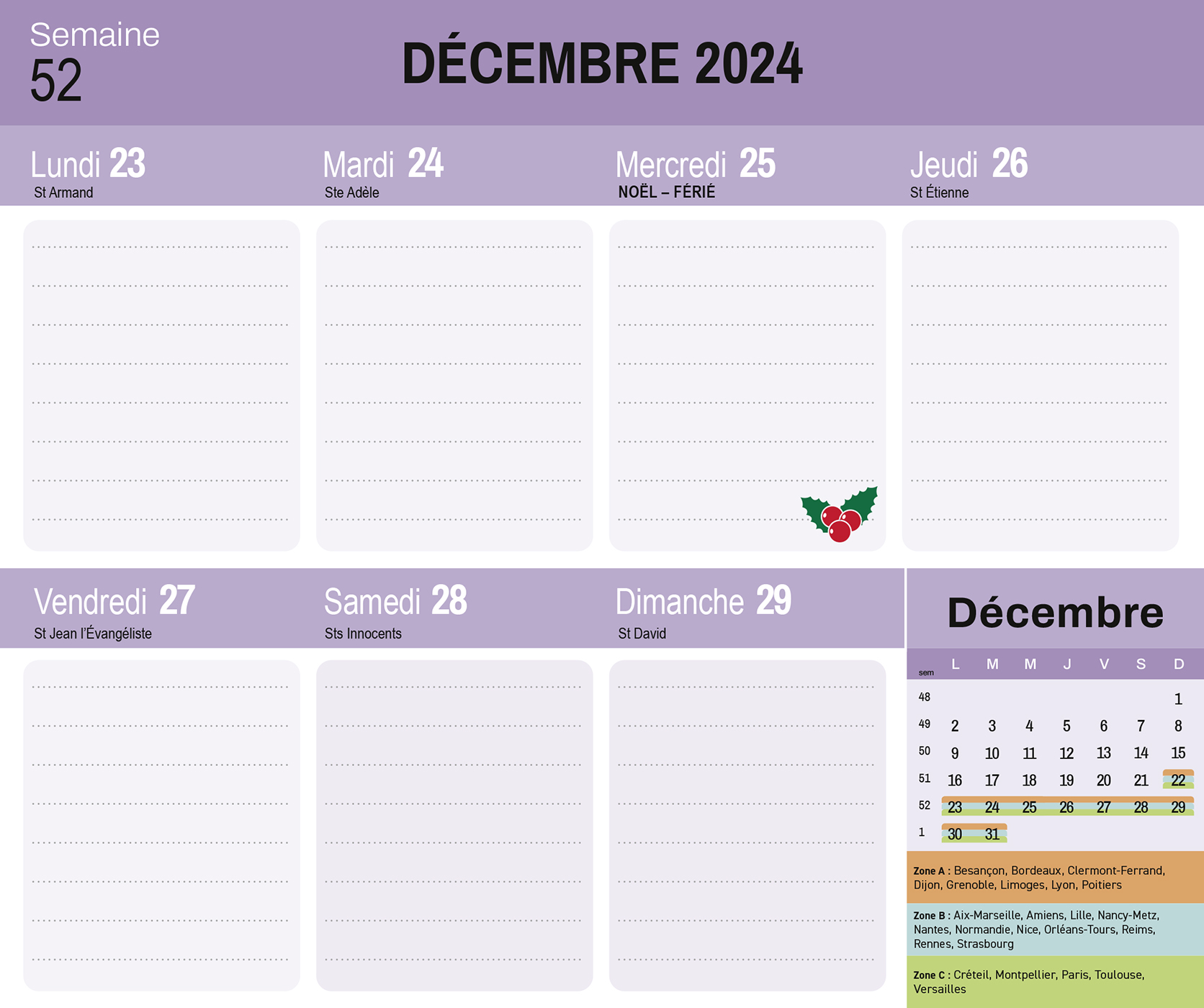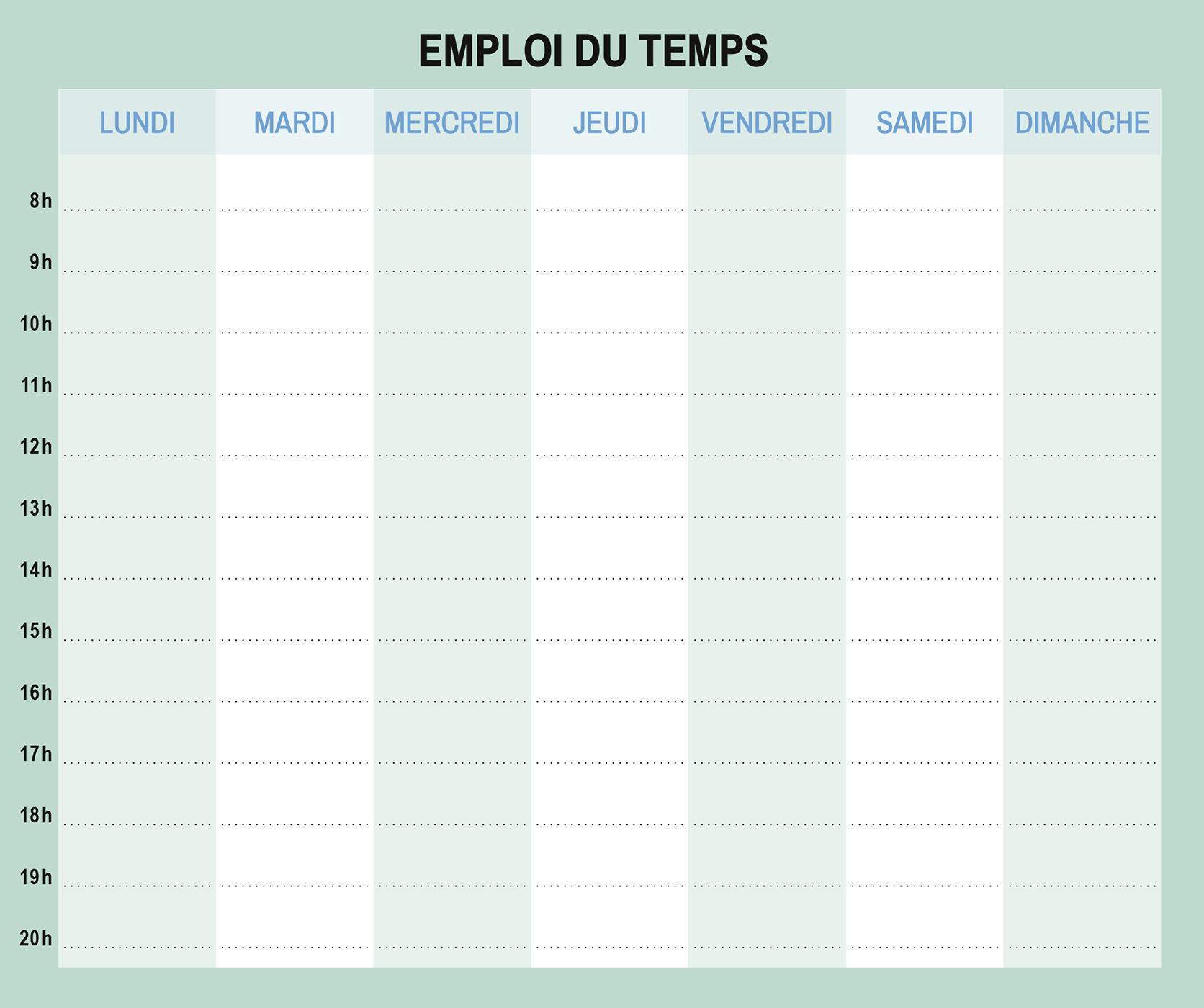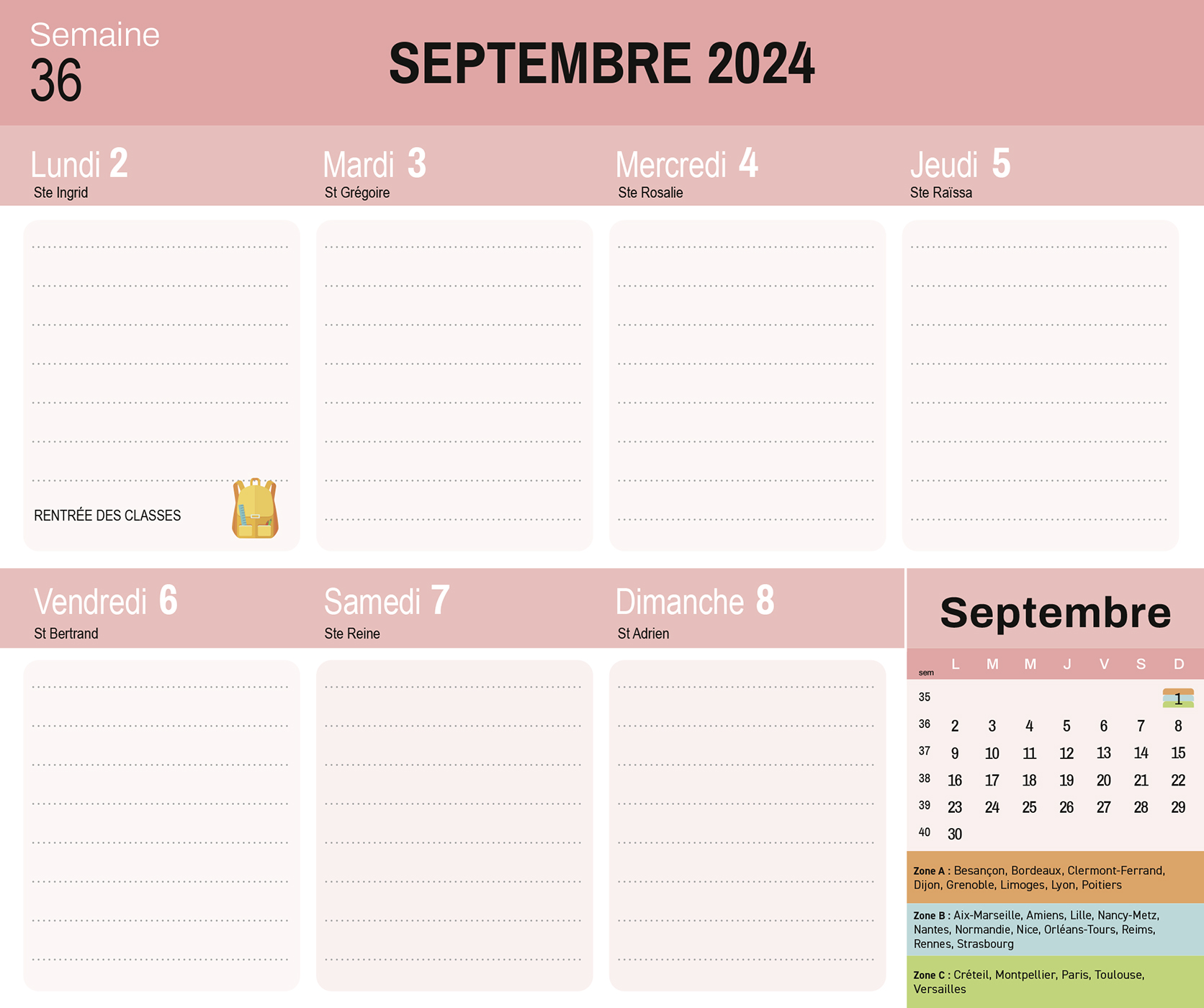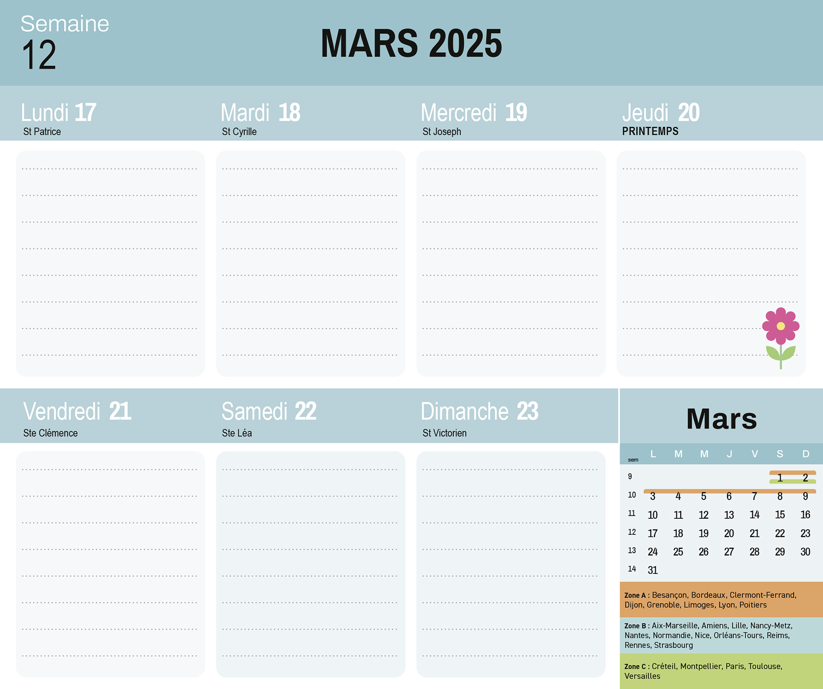 – 1 page d'organisation par semaine (grandes cases pour tout noter), avec les dates officielles des vacances scolaires