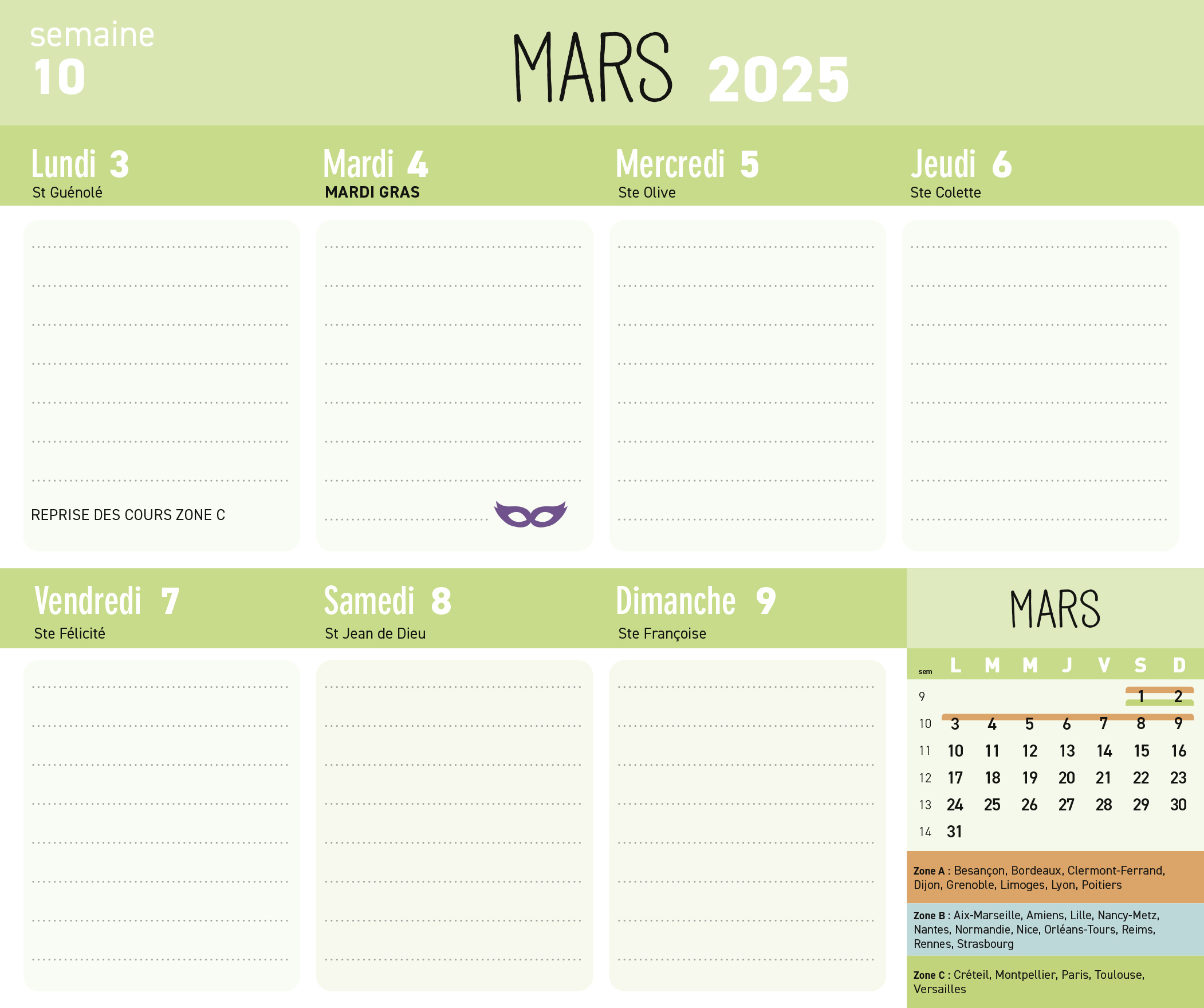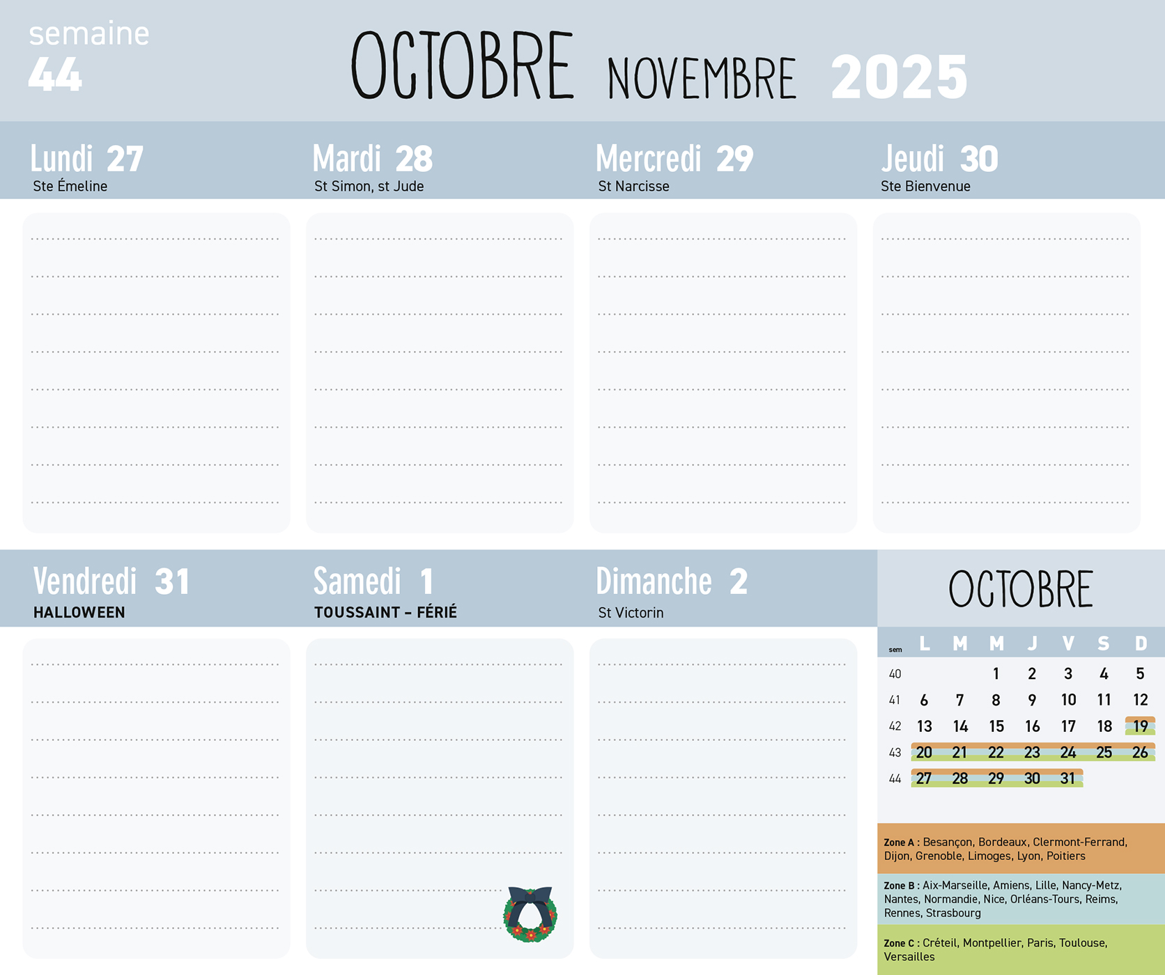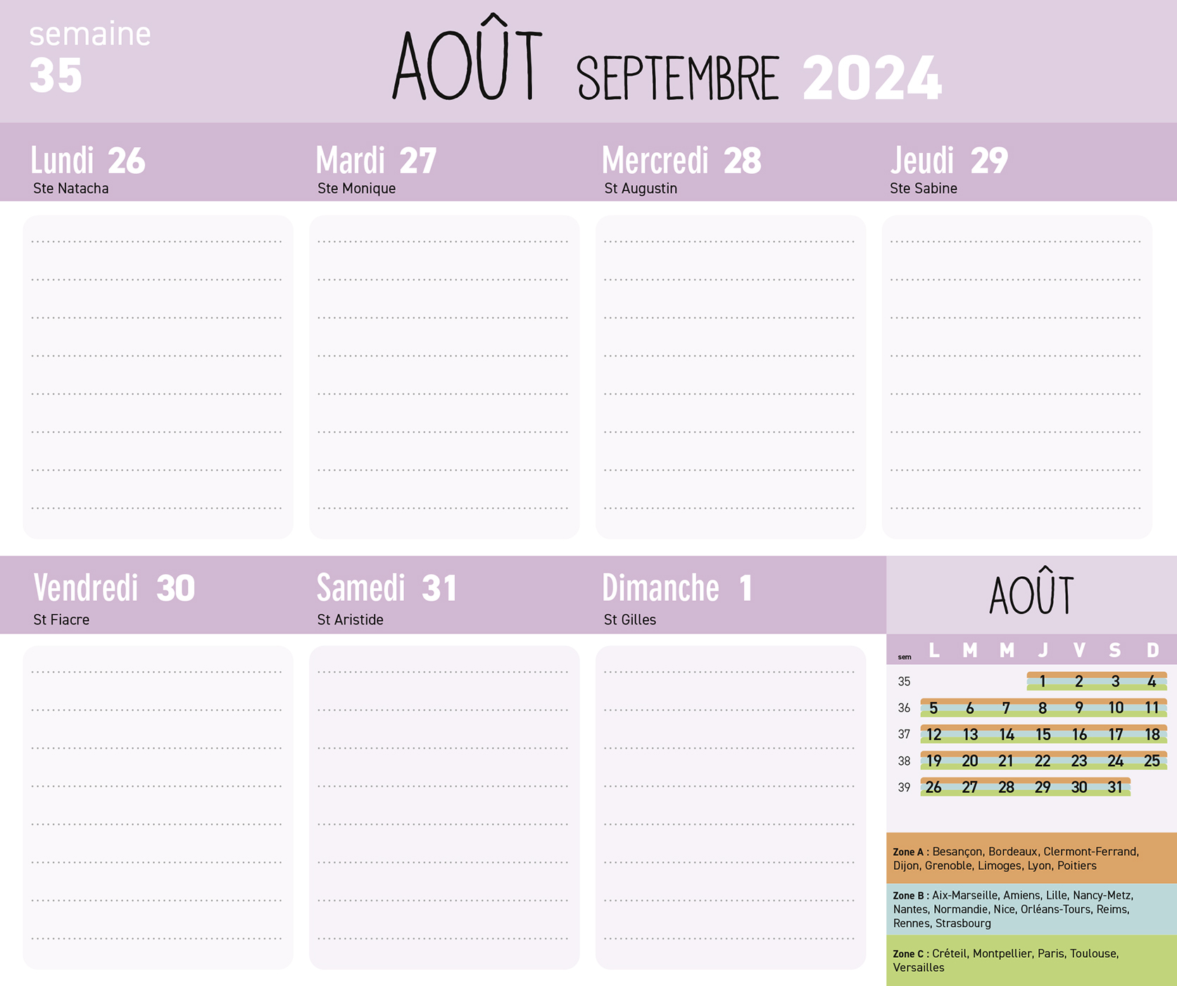 – 1 page d'organisation par semaine (grandes cases pour tout noter), avec les dates officielles des vacances scolaires