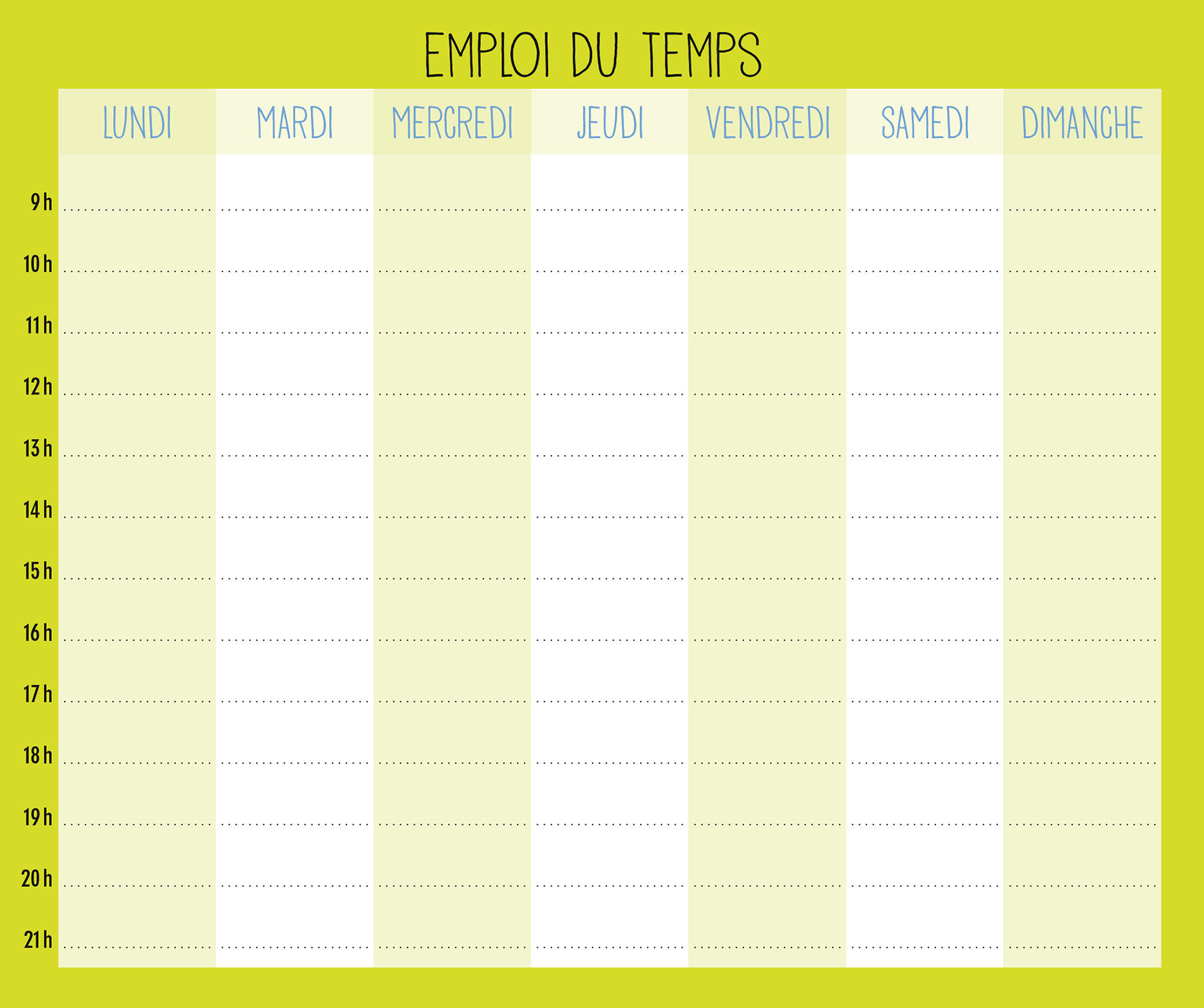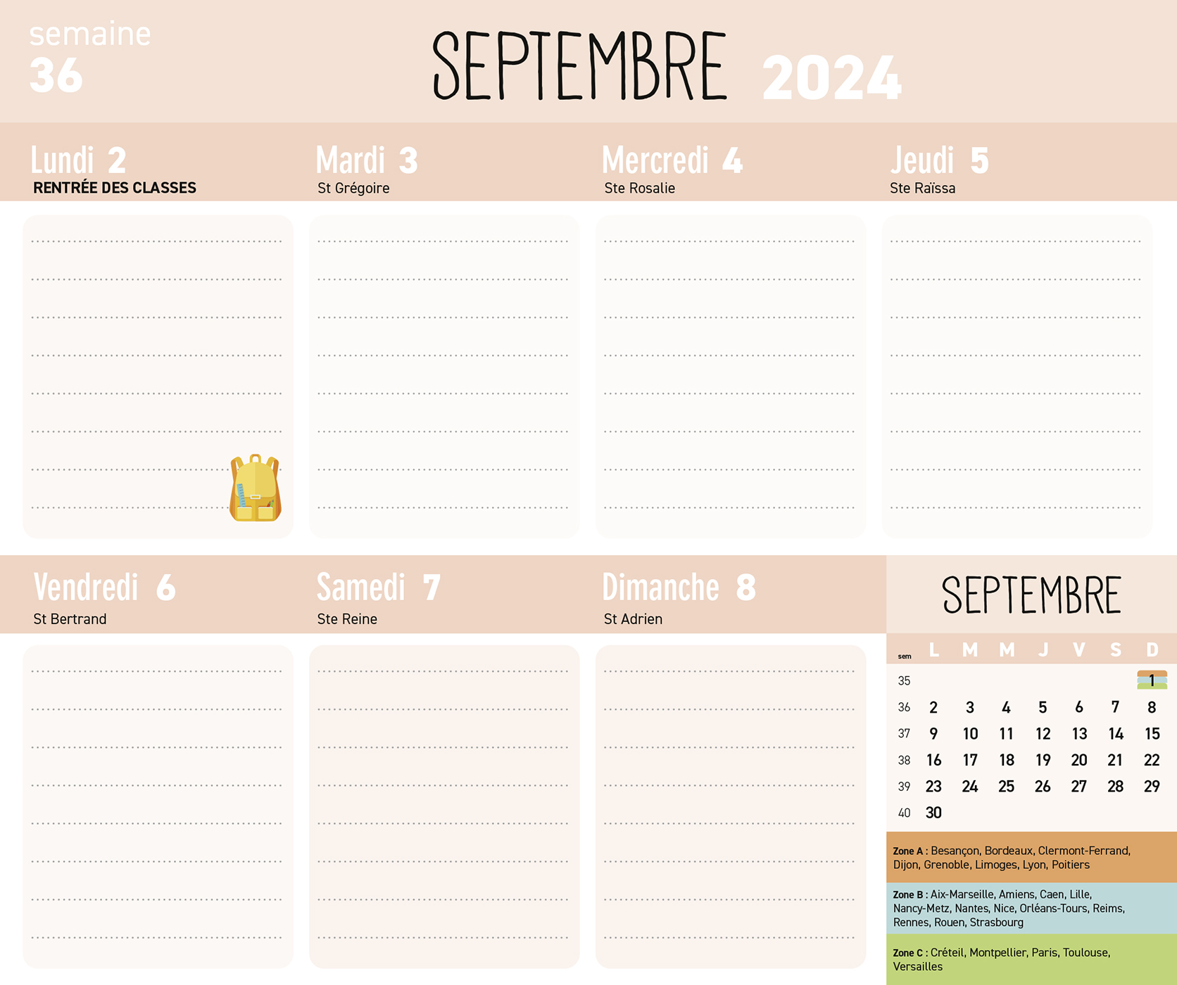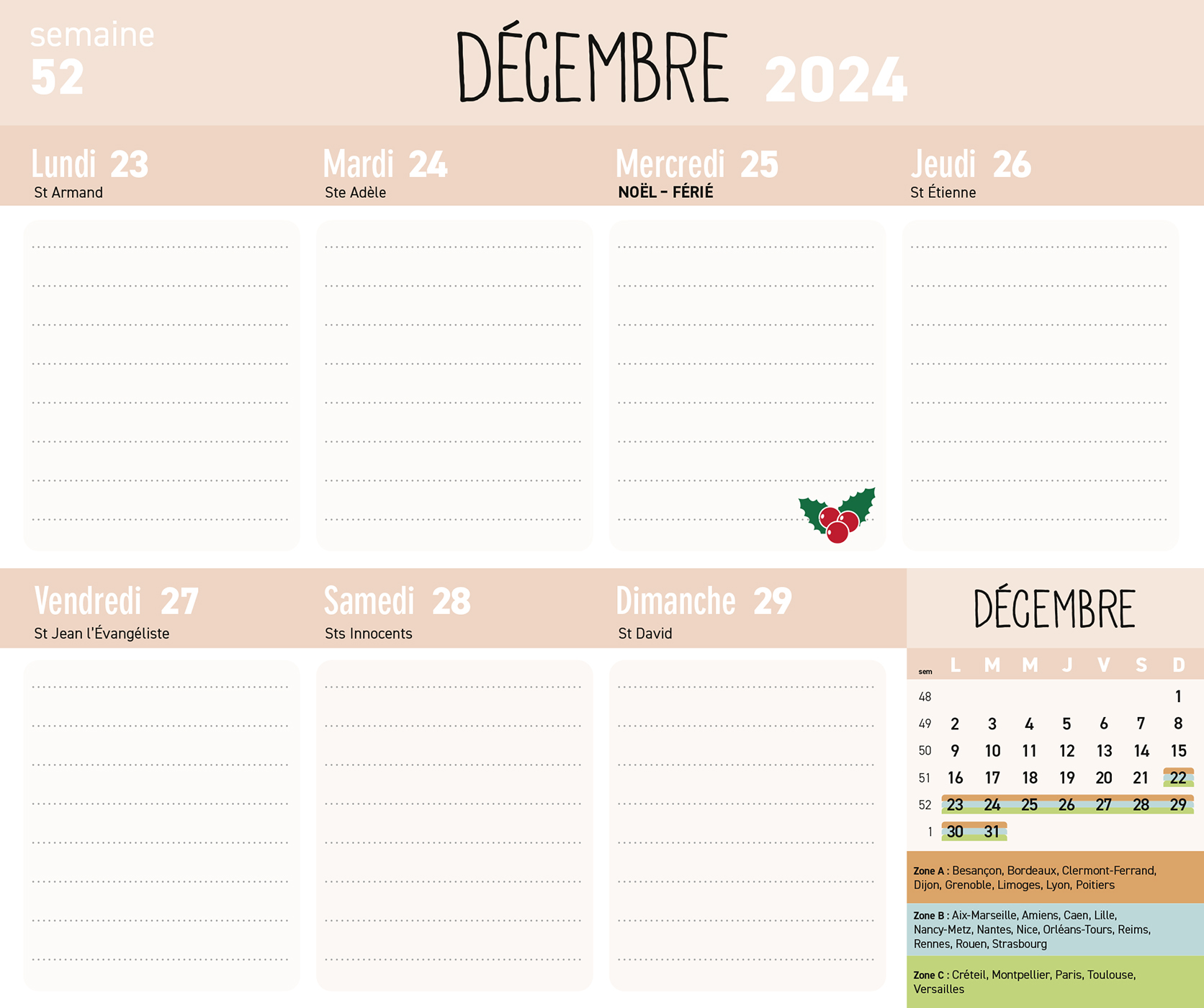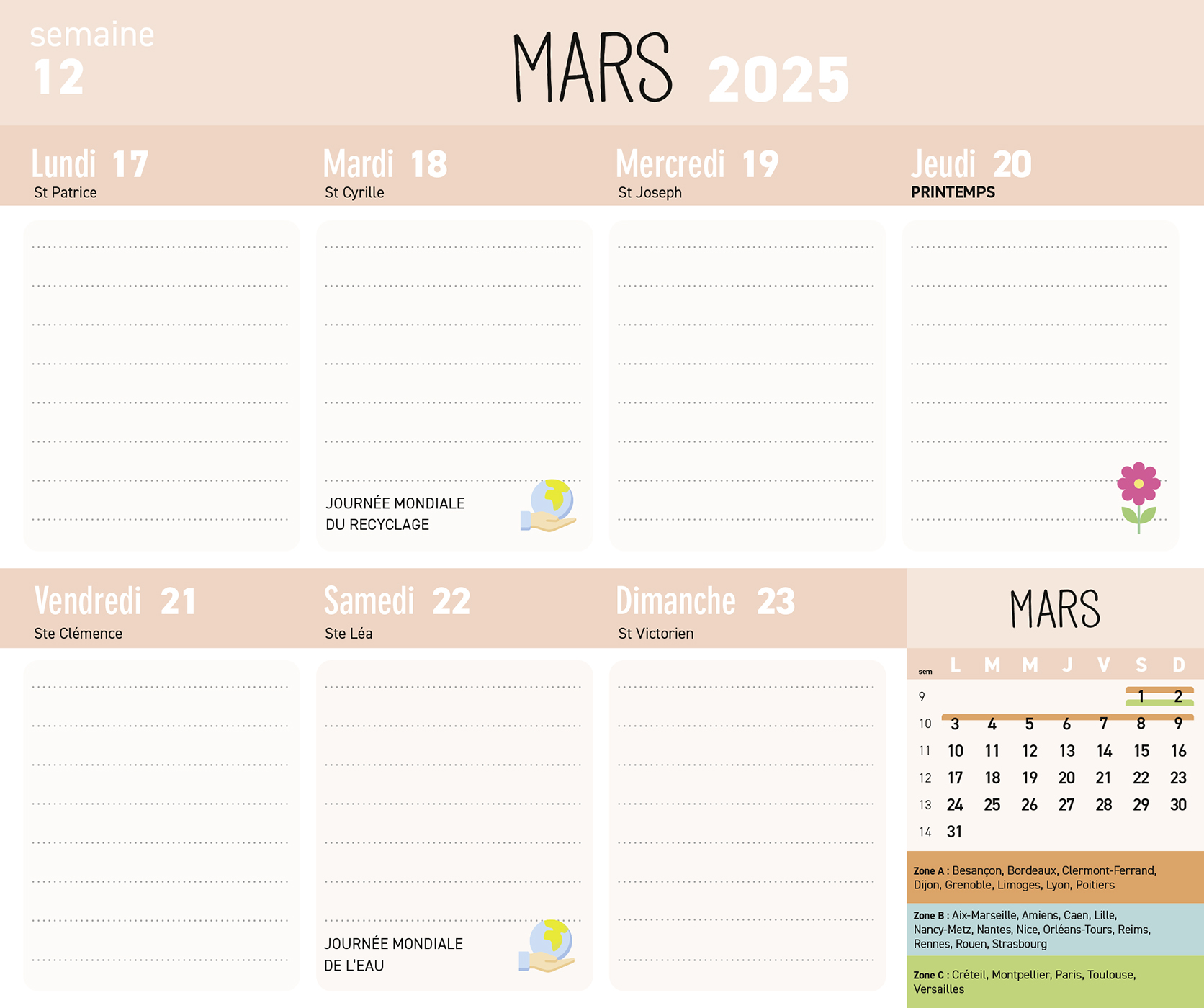– 1 page d'organisation par semaine (grandes cases pour tout noter) avec les dates officielles des vacances scolaires