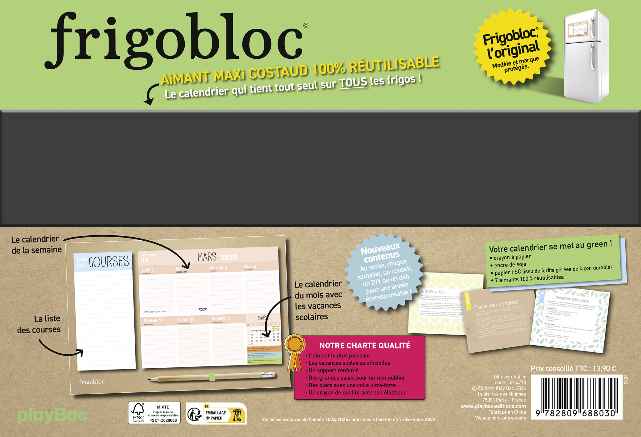 Fabrication eco-friendly : encre de soja, crayon à papier, papier FSC (issu de forêts gérées de façon durable), maxi aimant qui se découpe en 7 aimants 100% réutilisables.