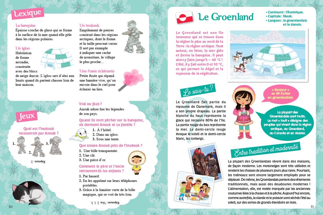 Retrouve à la fin du livre : des infos docu pour prolonger la découverte du pays, des jeux visuels, un lexique pour enrichir ton vocabulaire.