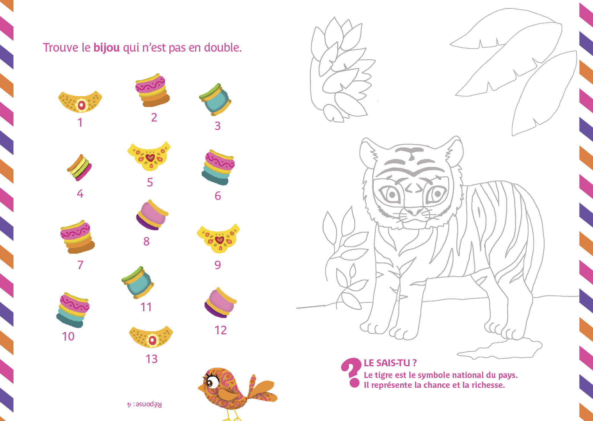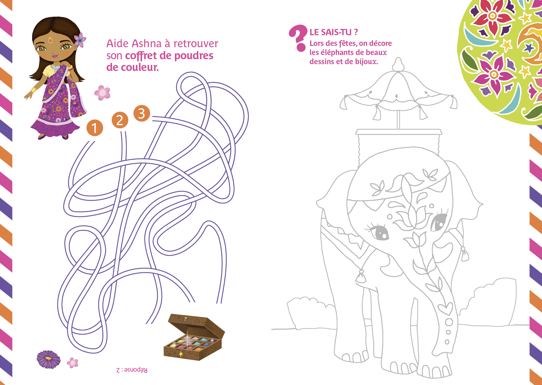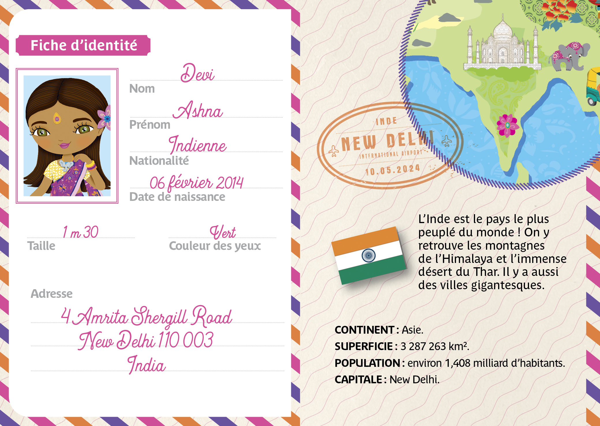 Pour compléter l’activité, l’enfant découvre l’Inde grâce à un livret-passeport contenant des informations documentaires, des jeux et des coloriages.