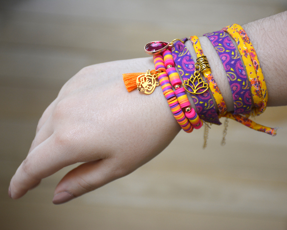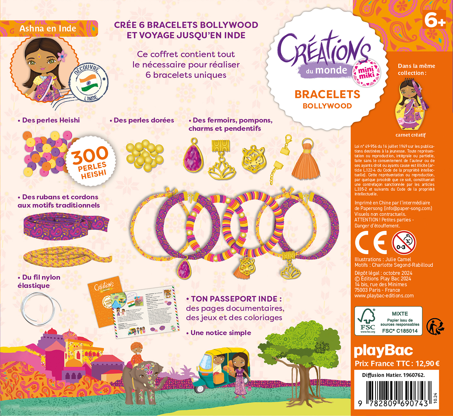Dans ce coffret, une notice en pas à pas et tout le matériel nécessaire pour créer six bracelets uniques aux couleurs de Bollywood, pour voyager jusqu’en Inde.