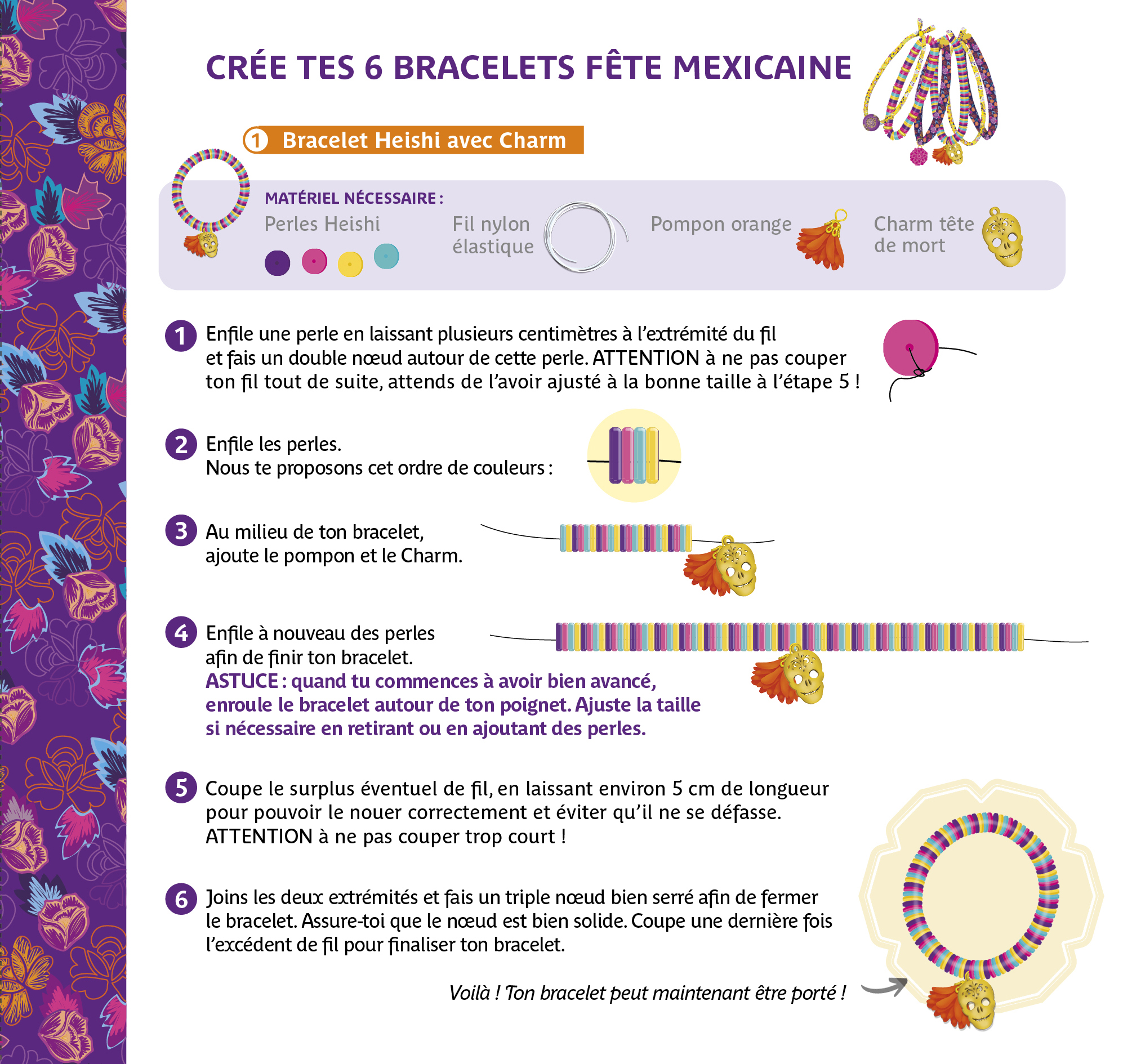 Dans ce coffret, une notice en pas à pas et tout le matériel nécessaire pour créer six bracelets uniques aux couleurs du Dia de los muertos, la fête mexicaine.