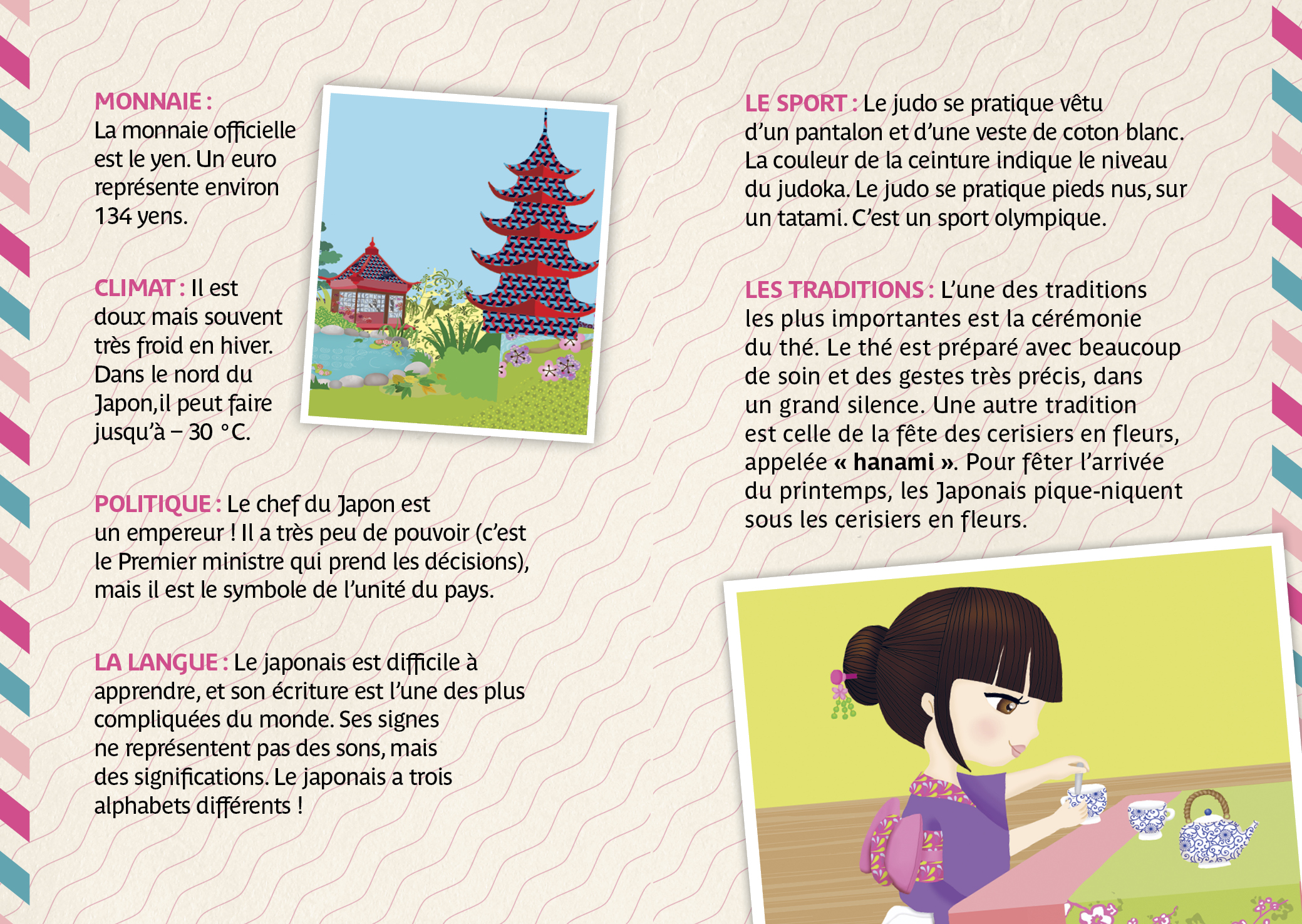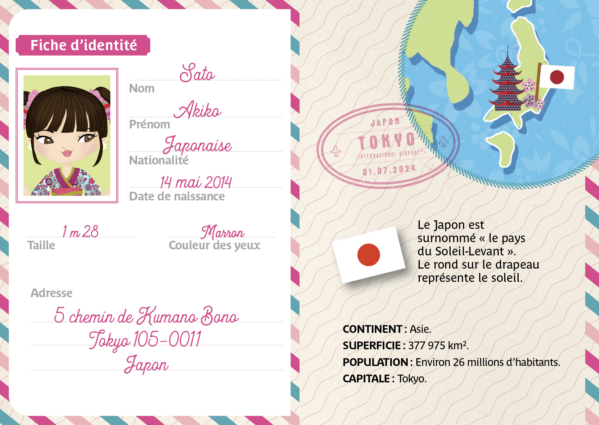 Pour compléter l’activité, l’enfant découvre le Japon grâce à un livret-passeport contenant des informations documentaires, des jeux et des coloriages.