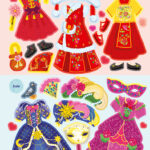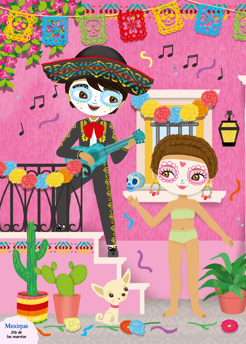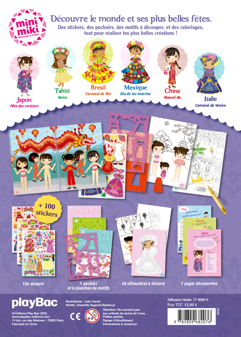 Un grand cahier à spirales pour créer des tenues traditionnelles et découvrir les fêtes et les coutumes de six pays : la fête des cerisiers au Japon, Heiva à Tahiti, le Carnaval de Rio au Brésil, el Día de los muertos au Mexique, le Nouvel An en Chine et le Carnaval de Venise en Italie.