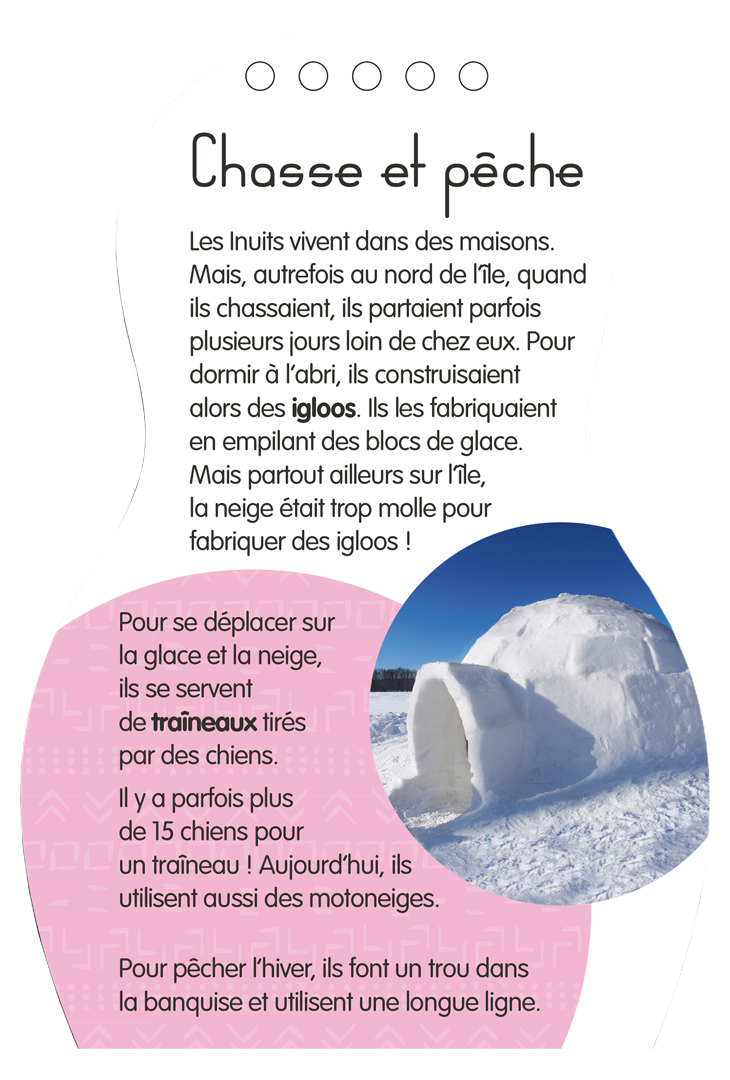 Et en plus, des infos documentaires sur les traditions et les tenues du Groenland : les vêtements, la chasse et la pêche, l'école, les animaux, l'alimentation, la danse du tambour.