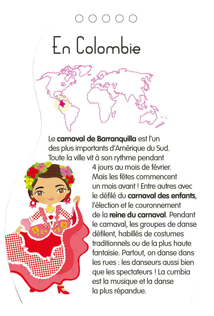 Et en plus, des infos documentaires sur les fêtes et carnavals du monde : les tenues folkloriques, les déguisements, les fêtes, la musique.