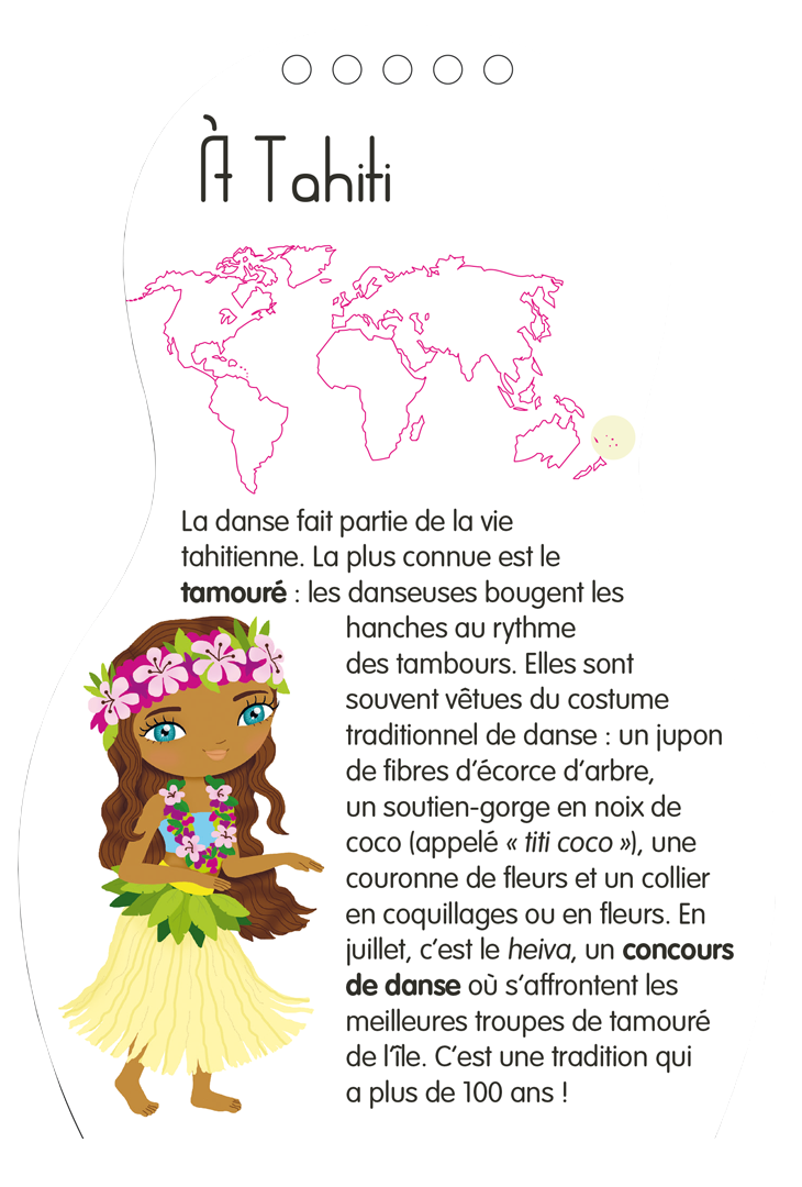 Et en plus, des infos documentaires sur les pays du monde : les robes traditionnelles, les fêtes, la musique.