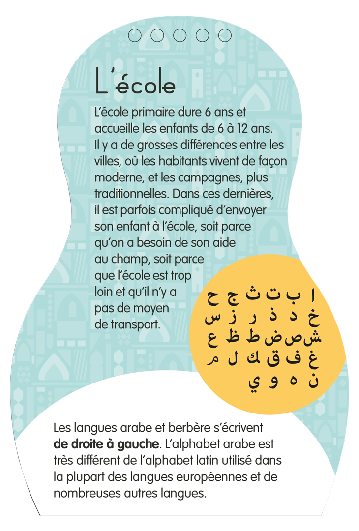 Et en plus, des infos documentaires sur les traditions et les tenues du Maroc : les vêtements, le thé à la menthe, l'école, le tatouage au henné, l'alimentation, les animaux.