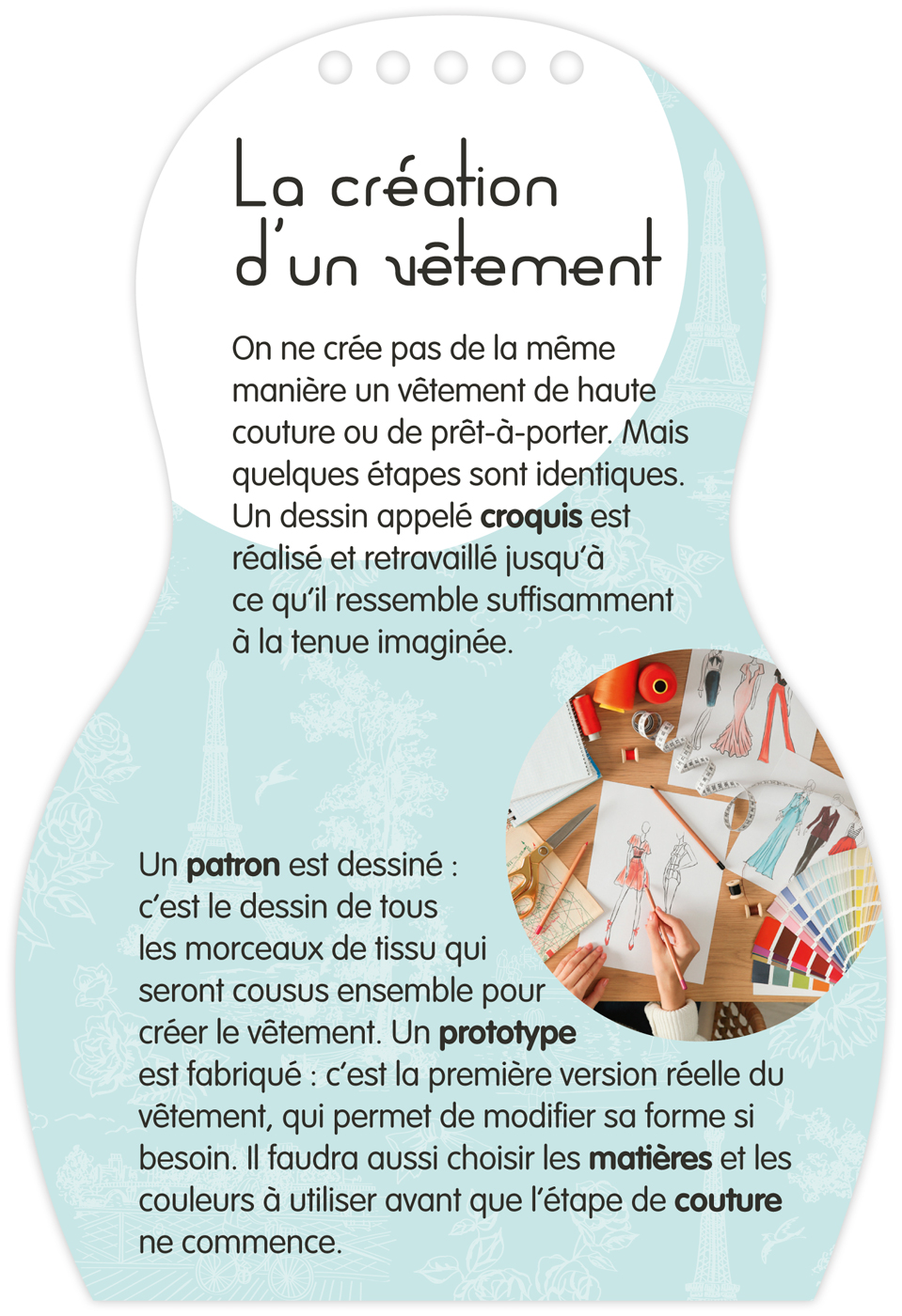 Et en plus, des infos documentaires sur la mode : la création d’un vêtement, les accessoires, les savoir-faire, la haute-couture, l’histoire des défilés de mode…