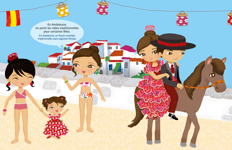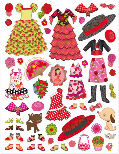 Avec 300 stickers et 12 scènes, l'enfant imagine et crée les plus belles tenues pour assister à un cours de flamenco, se détendre à la plage ou encore visiter la merveilleuse ville de Barcelone.