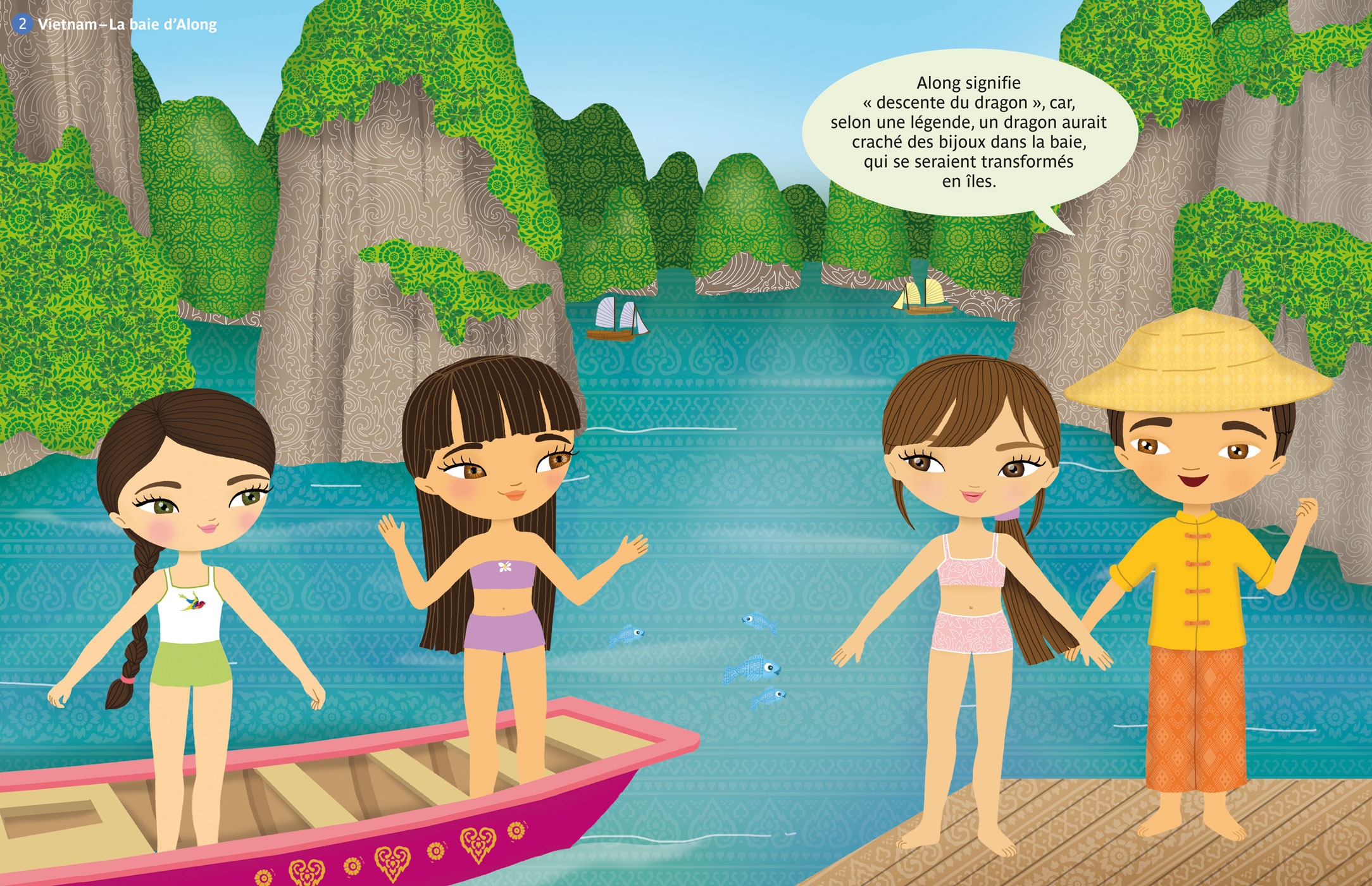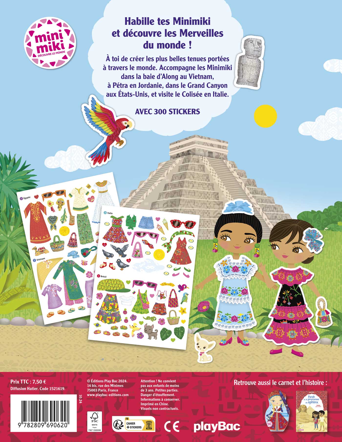 Un cahier de stickers pour créer des tenues en découvrant le monde. L’enfant accompagne les Minimiki dans la baie d’Along au Vietnam, à Pétra en Jordanie, dans le Grand Canyon aux États-Unis, visite le Colisée en Italie, et les habille des plus beaux vêtements et accessoires.