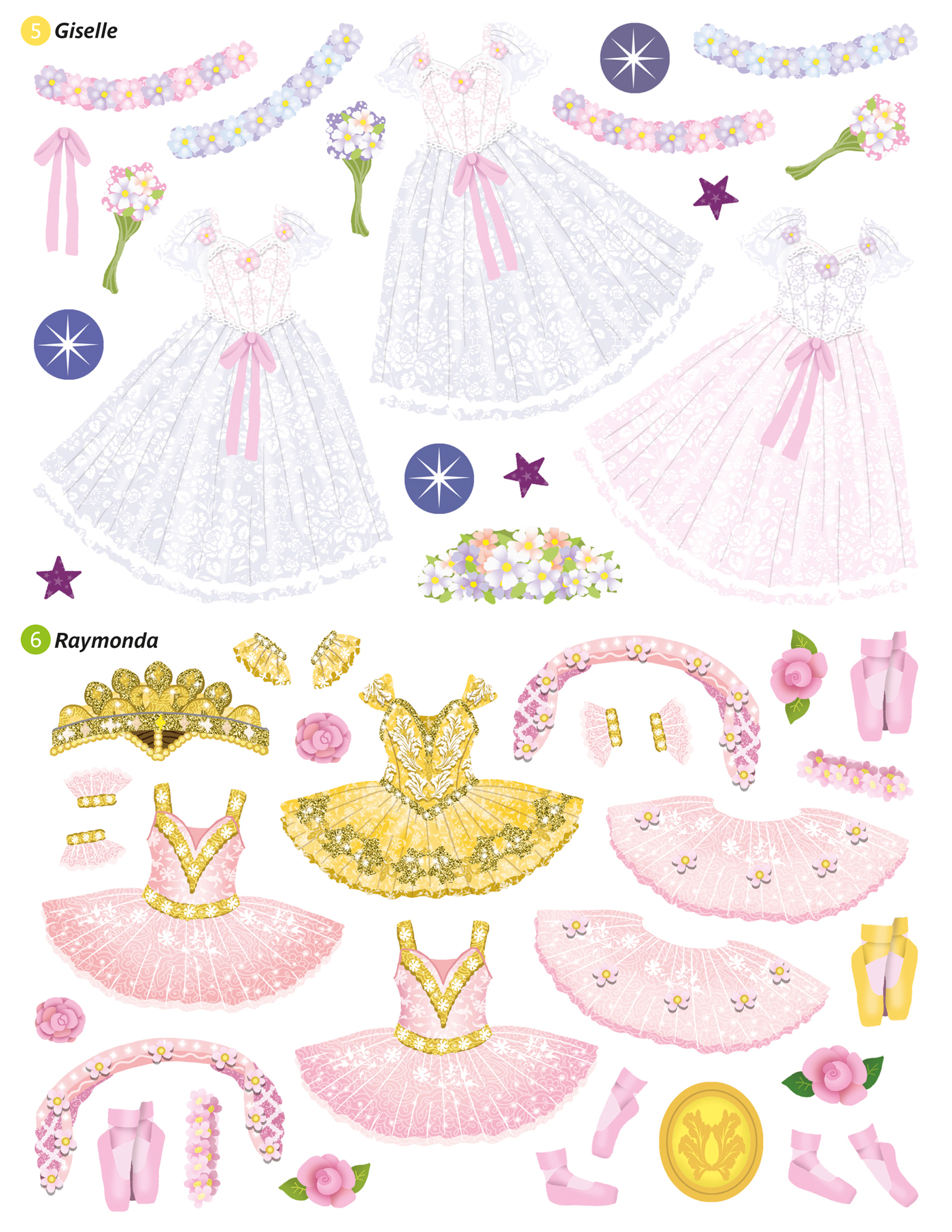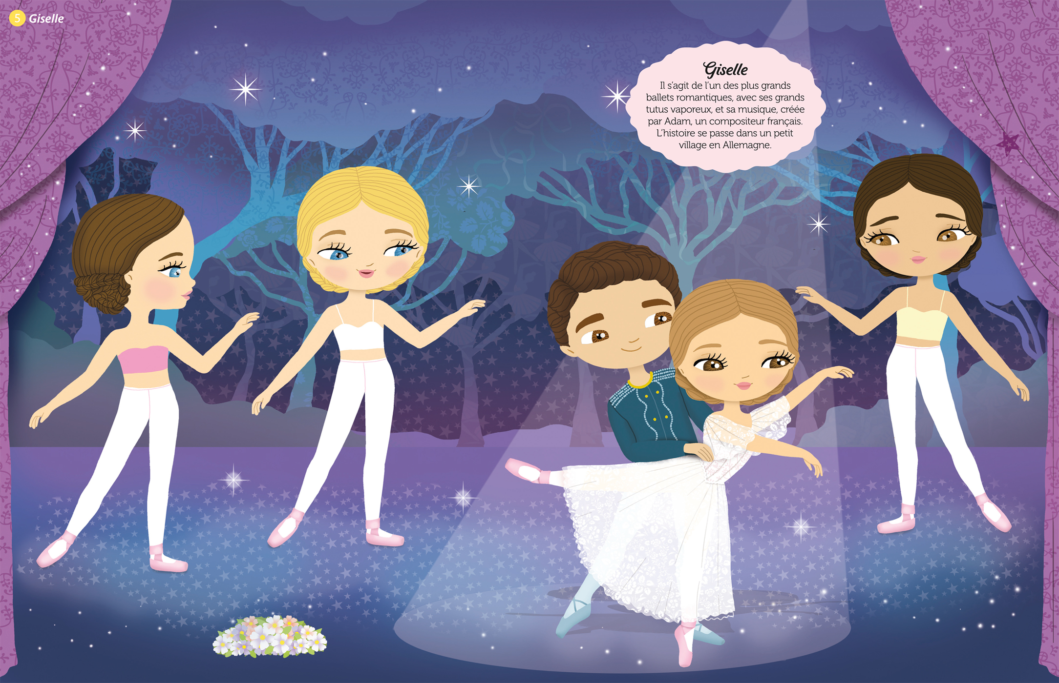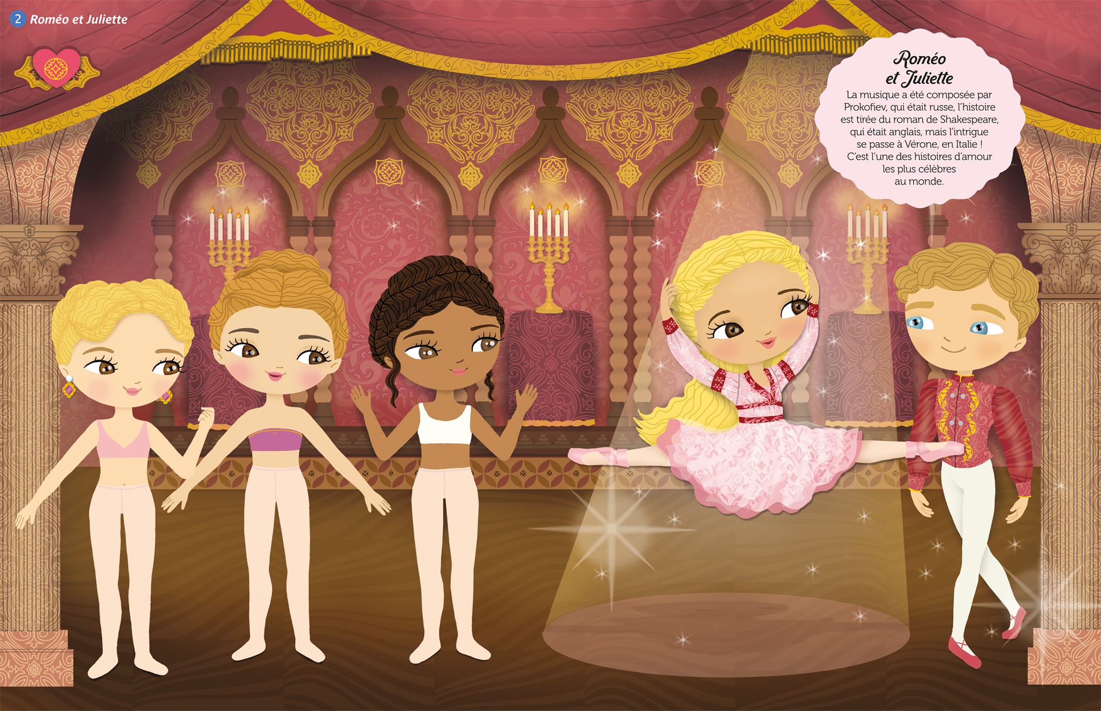 Avec 300 stickers et 12 scènes, l'enfant imagine et crée les plus belles tenues de scène pour danser sur Giselle, Roméo et Juliette, le Lac des cygnes, ou encore la Belle au bois dormant.