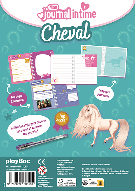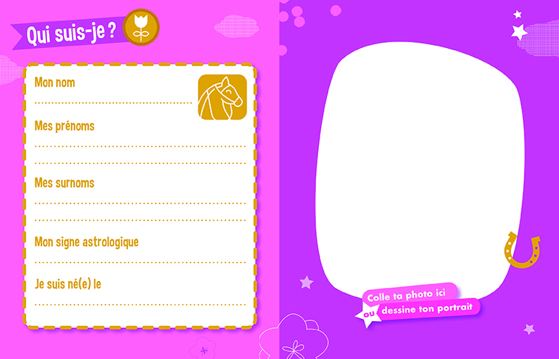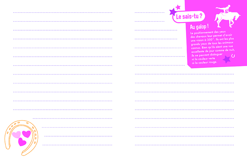 De jolies pages pour confier ses secrets et raconter ses journées, des espaces pour coller des photos ou dessiner les instants que l'on souhaite garder en mémoire, des petits coloriages pour se détendre, des quiz sur les chevaux, des fiches "caractère" pour apprendre à se connaitre soi-même et lister ses envies, et des fiches découvertes sur l'équitation pour vivre pleinement sa passion !