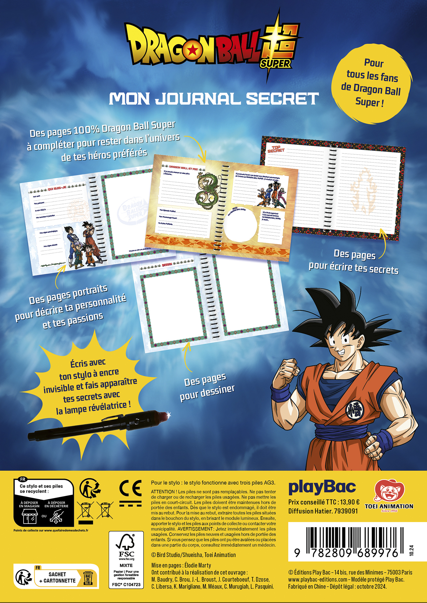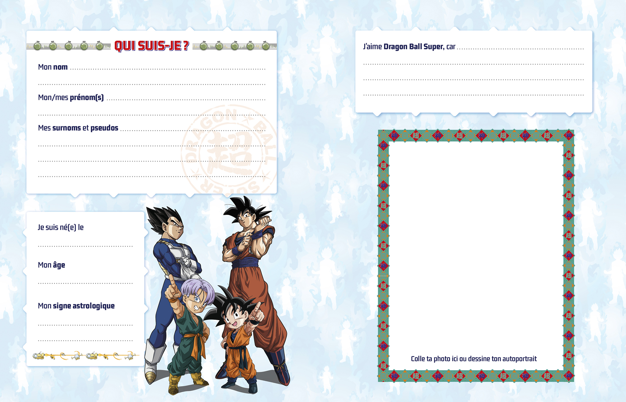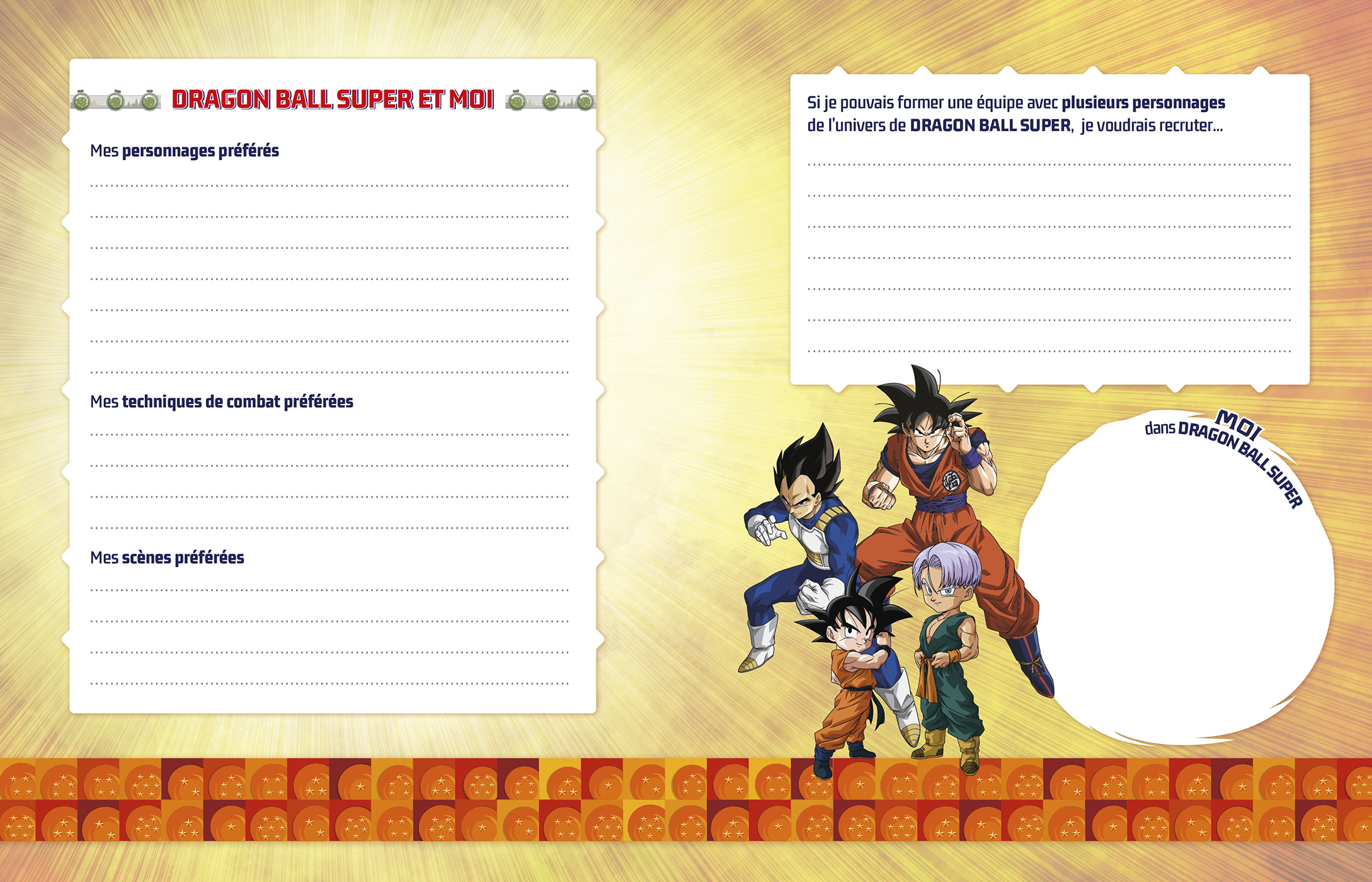 Des pages pour écrire tes secrets, des pages portraits pour décrire ta personnalité et tes passions, des espaces pour dessiner et des pages 100% Dragon Ball à compléter pour rester dans l’univers et vivre sa passion à fond !