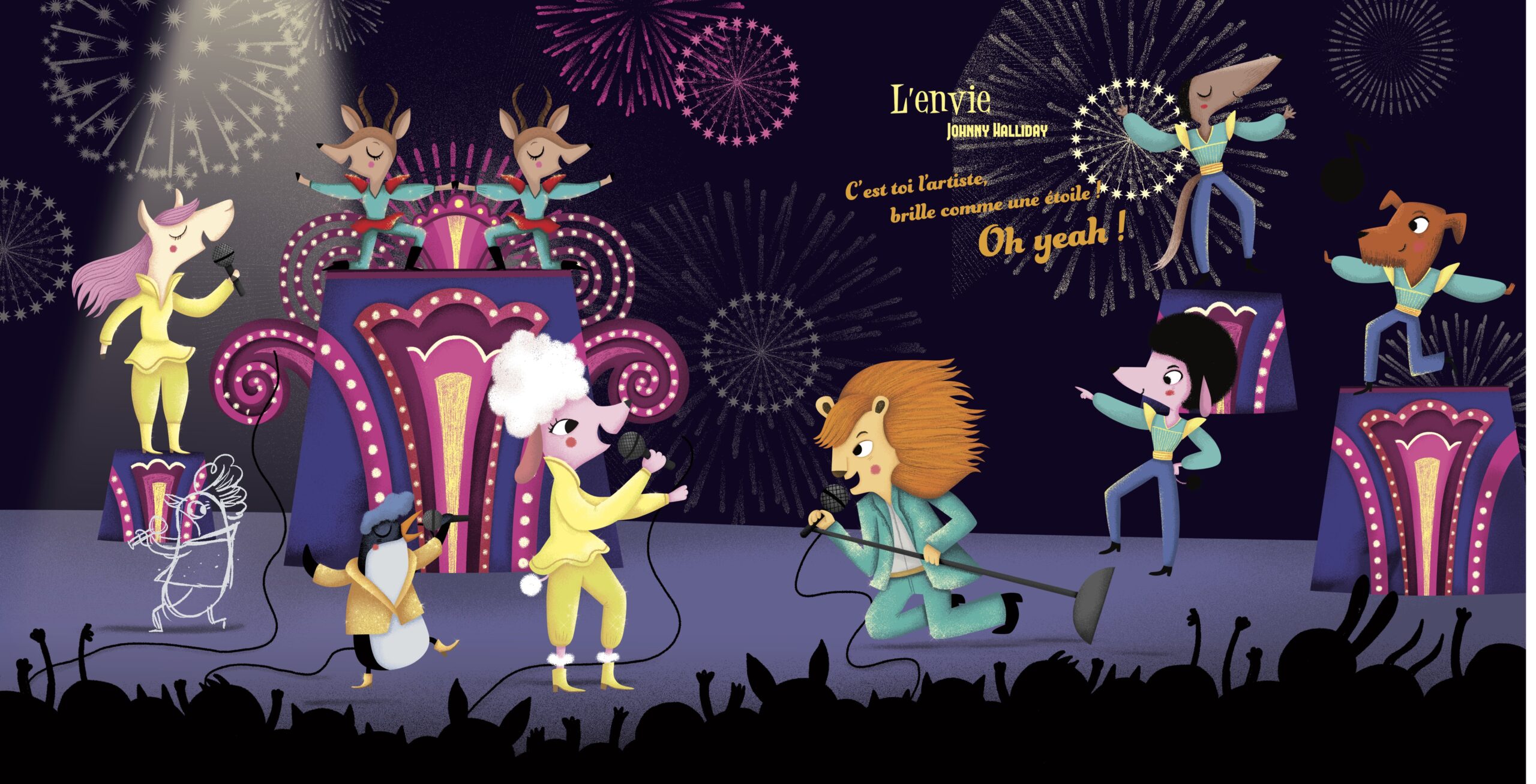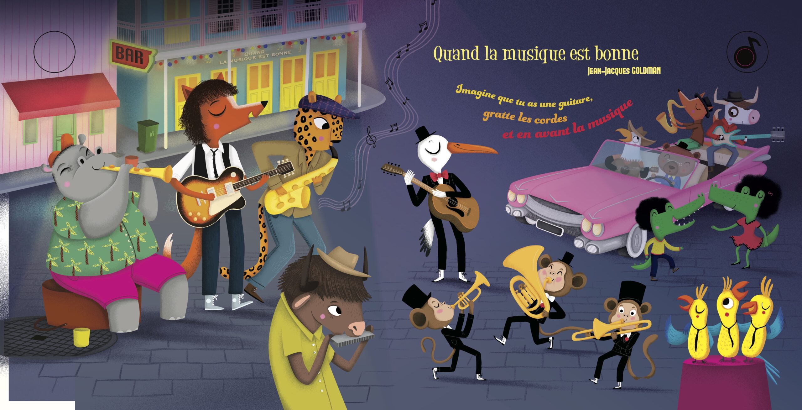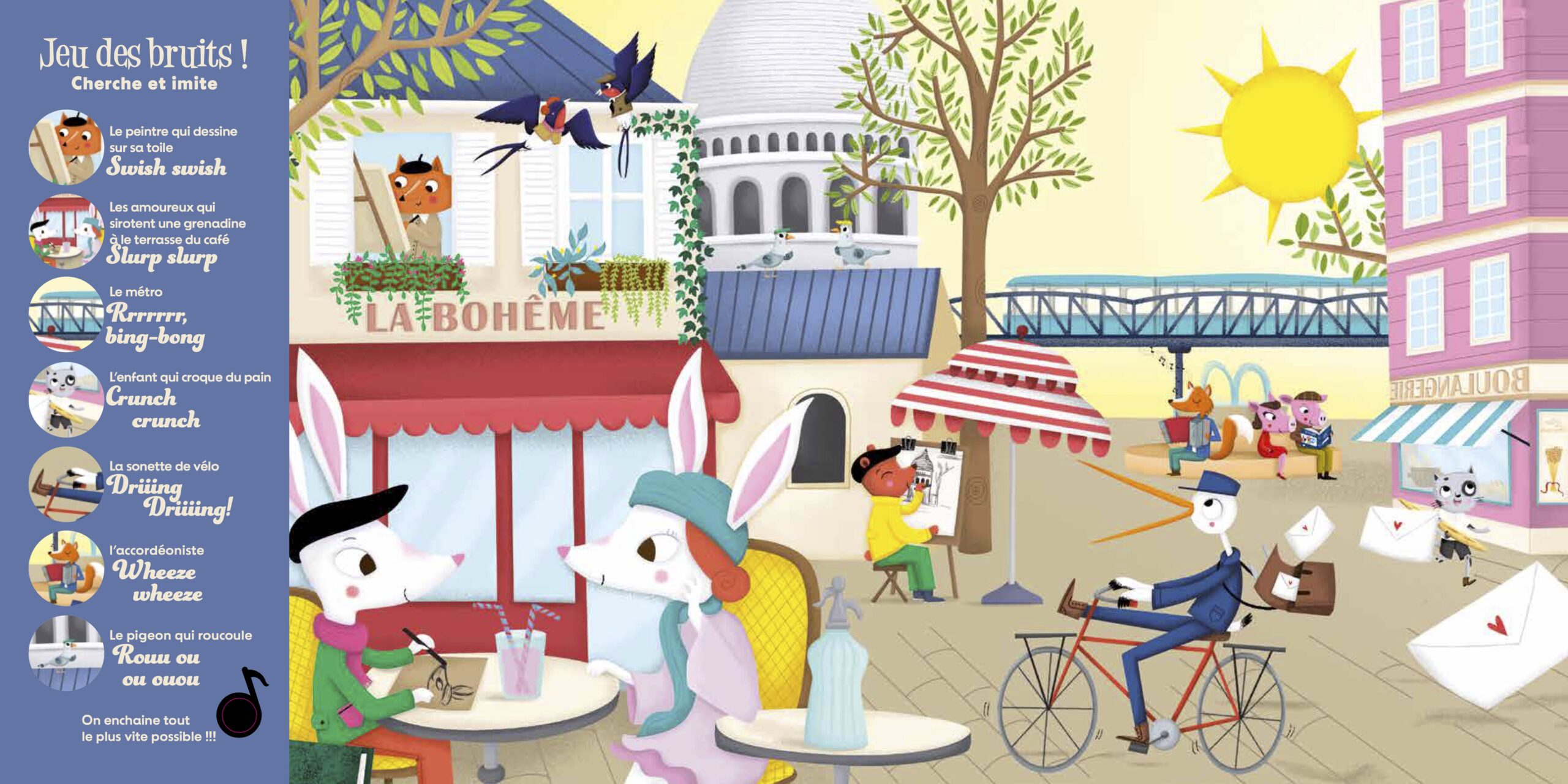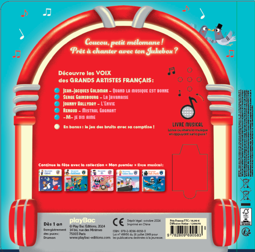 Faites découvrir à votre enfant les titres culte de la chanson française dans ce grand livre façon jukebox ! Votre tout-petit s'amuse à chercher la puce sonore dans une grande scène joliment illustrée et appuie dessus pour lancer la musique tout seul.