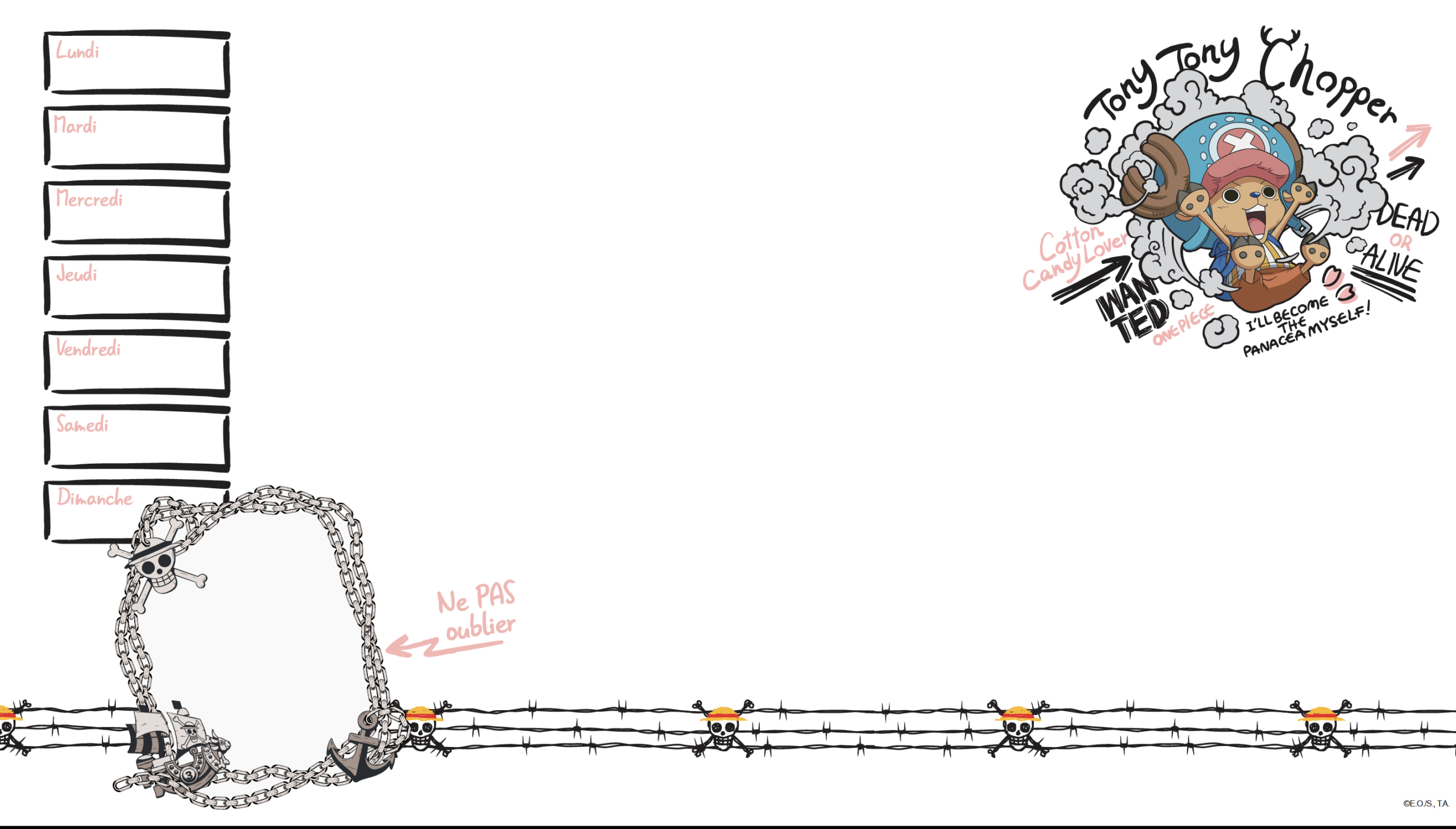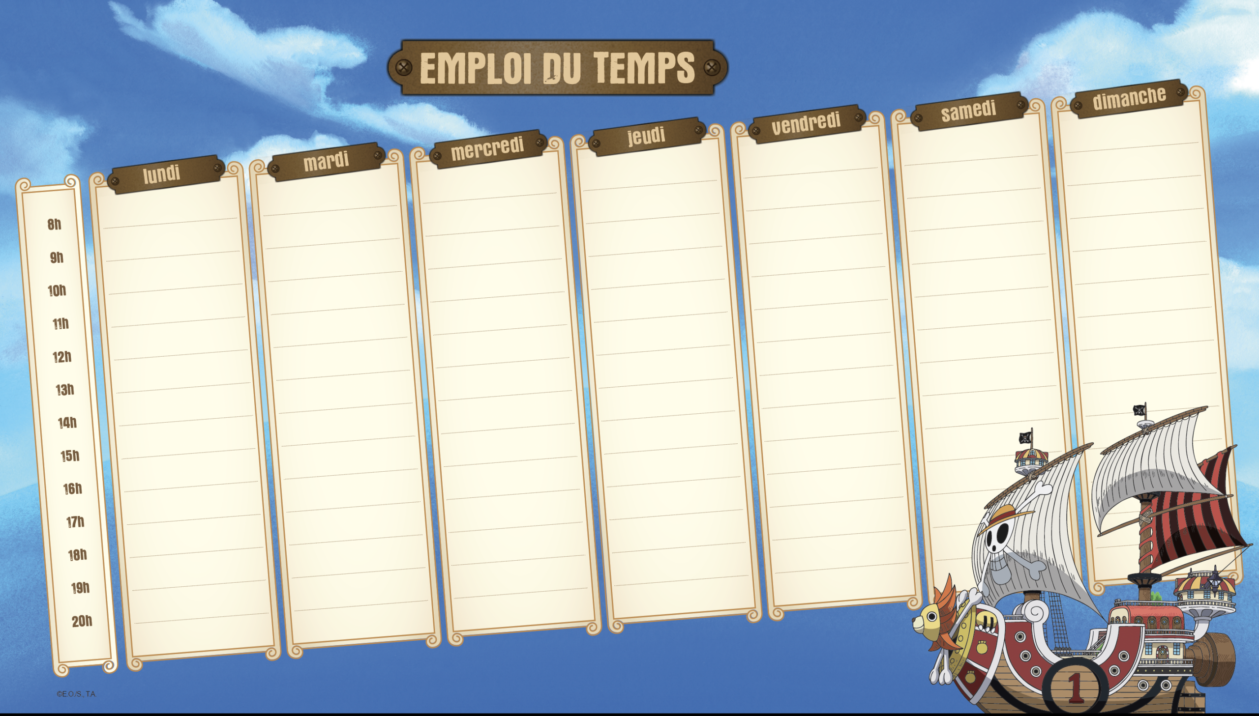 - 52 pages hebdomadaires aux couleurs de One Piece avec des grands espaces de dessins, de notes et un semainier.