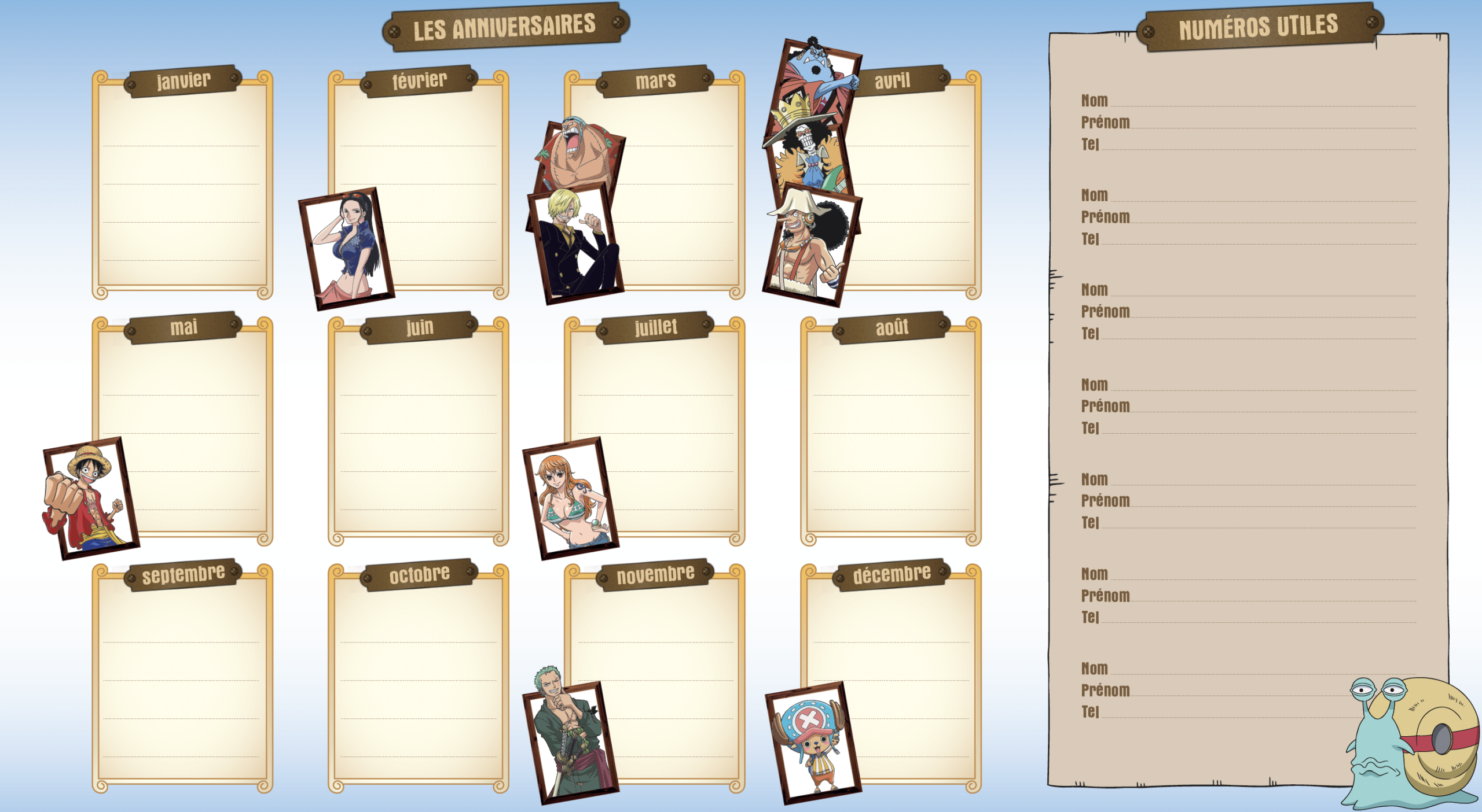 - Une page pour noter les anniversaires et les numéros utiles