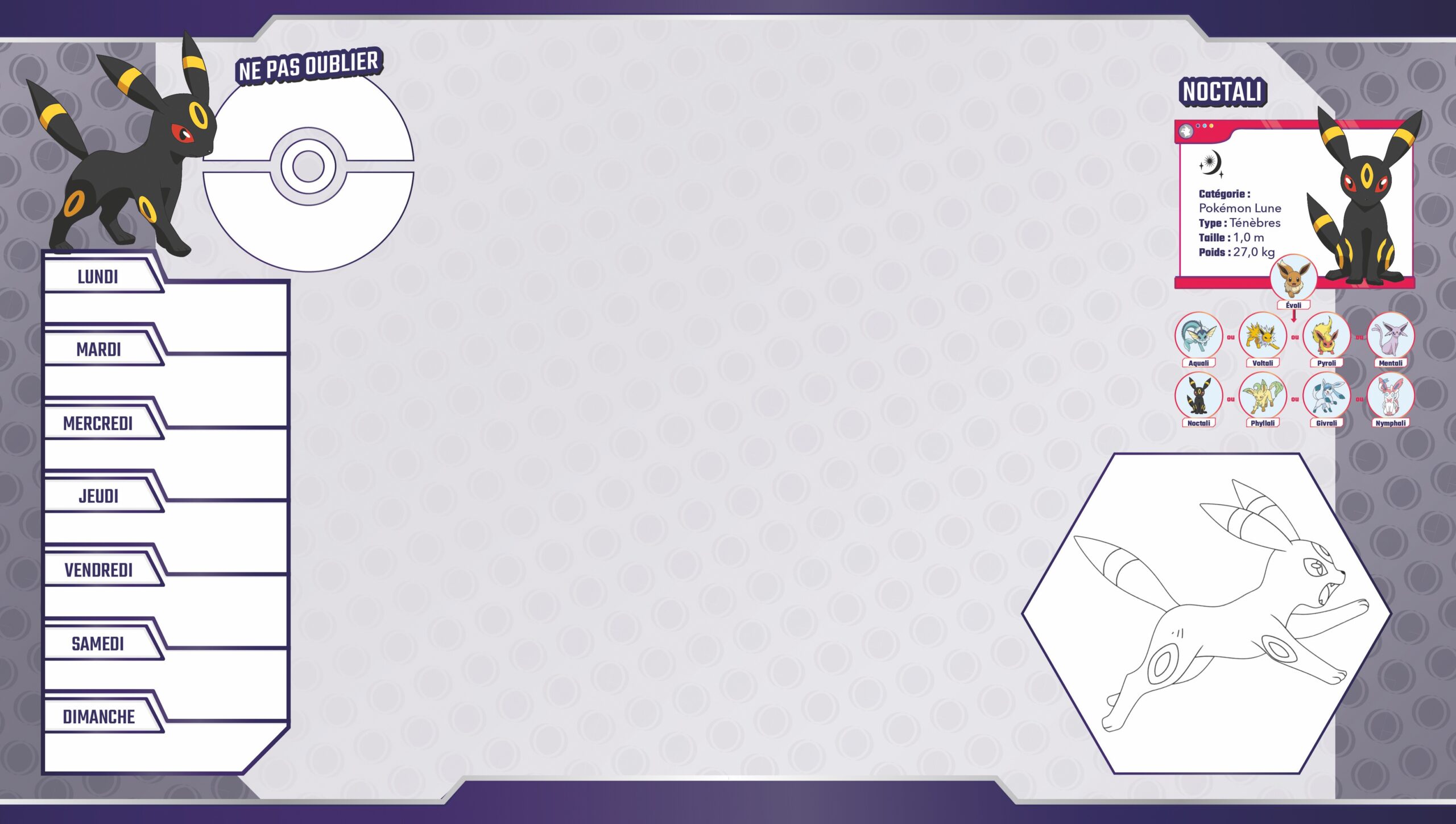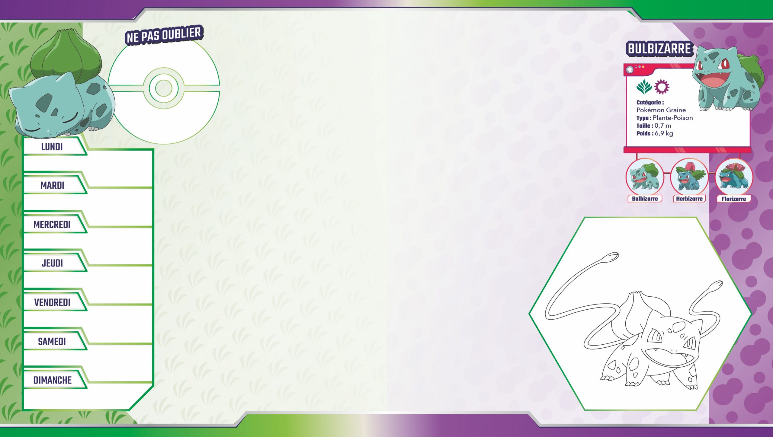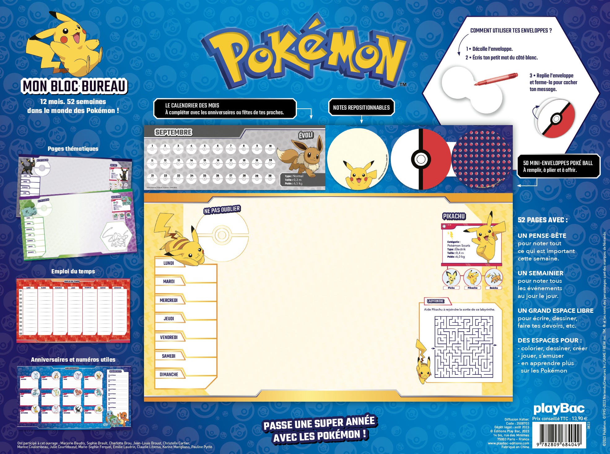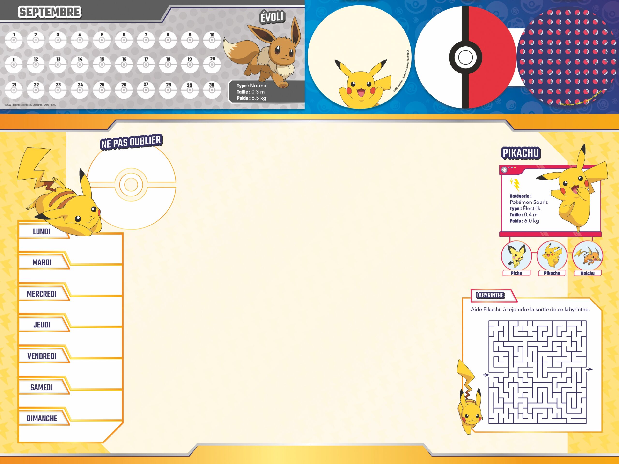 > 1 bloc de 52 pages avec un grand espace libre pour écrire, dessiner, faire tes devoirs ; un pense-bête pour noter ce qui te semble important ; un semainier pour noter tes évènements importants de la semaine ; et des espaces pour colorier, jouer et en apprendre plus sur les Pokémon.