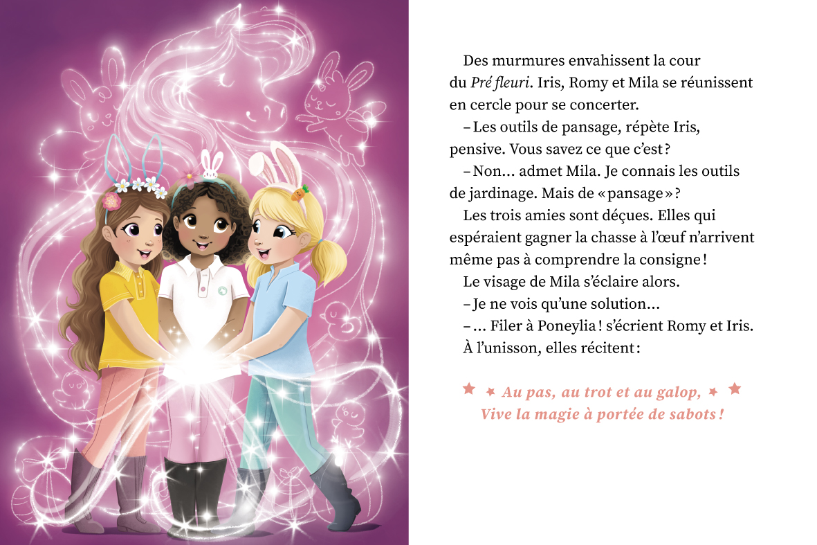 Les trois amies partent à Poneylia percer les sercrets des soins aux chevaux en s'excercant avec…des licornes ! Et pour récompenser chaque défi relevé : des oeufs en chocolat enchantés sont à récolter.